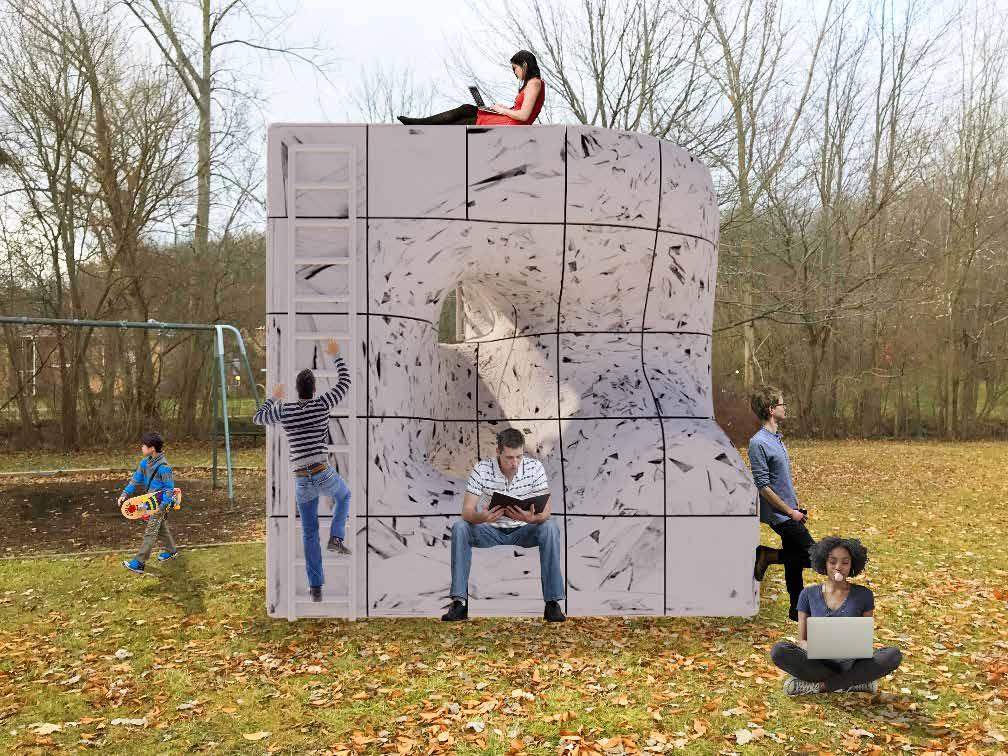 Inspired by the foam cube, this volume is built from 14’x14’ and 14’x28’ marble blocks, with a ladder for accessing different levels. Preserving smooth surfaces and sharp edges, it serves as a playground addition to the island park. The organic shape invites visitors to play, climb, and relax, enjoying the light and shadow effects from its various openings.