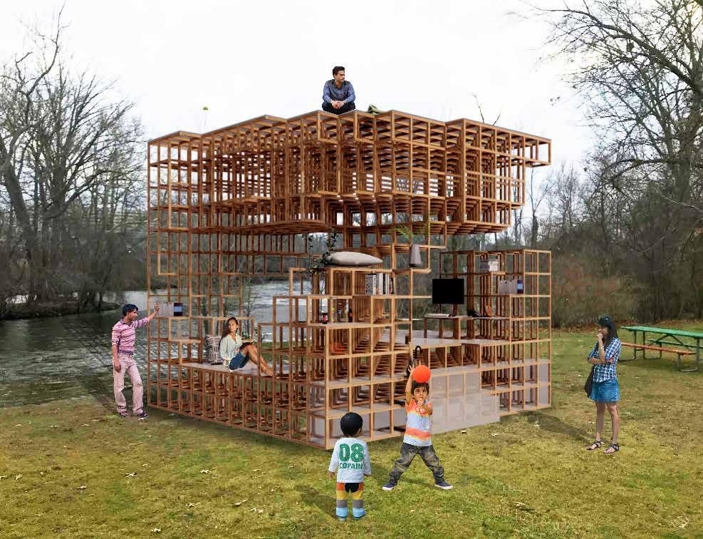 The panel-constructed space initially appears complex and difficult to navigate. However, by strategically removing some panels and creating openings, it transforms into an engaging small maze. Inside, visitors can enjoy the dynamic interplay of light and shadow throughout the day. A stairway offers access to a top platform, providing a scenic view of the river.