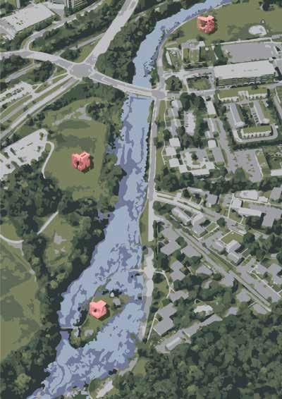 The next step is to examine their geometric significance and potential application to the real-world. All three models are expanded and given a scale of roughly 14’ by 14’ to become an occupiable space. Considering their potential usages corresponding to each formal logic, they are placed among the river parks in Ann Arbor along the Huron river shore.