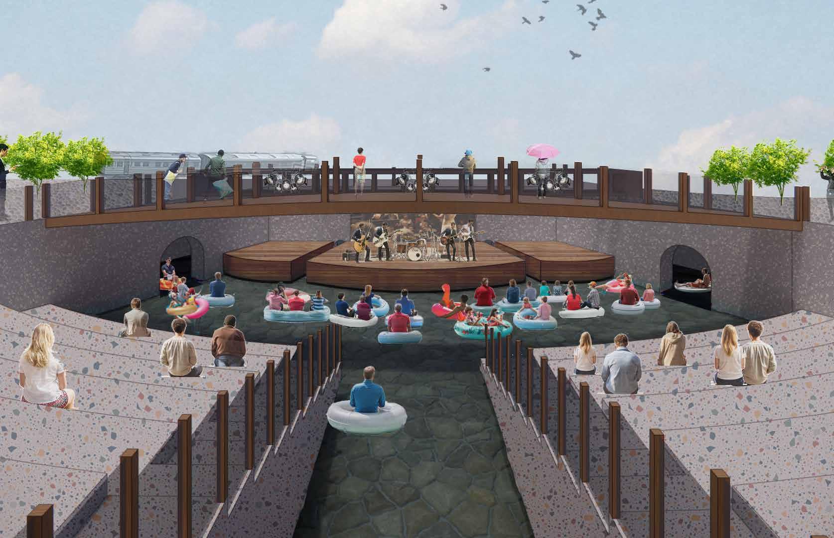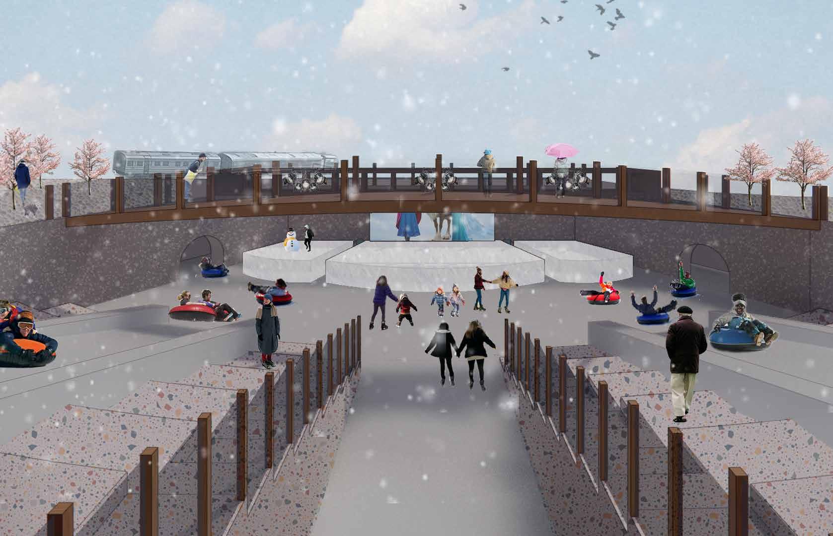 Historically, Allen Creek once flowed through this area, now buried underground with a water level depth of around 12 feet. By excavating, the outdoor theater can be flooded with creek water, enabling summer visitors to enjoy movies while floating on tubes. In winter, the space transforms into a vibrant playground for various ice activities.