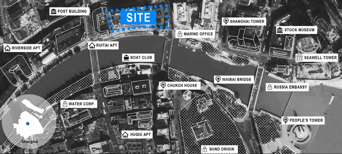 The site located on the north shore of the Suzhou River, with immediate closeness to the Bund area of Shanghai, is surrounded by residential neighborhoods and office complexes that are in desperate need of public space. The area is densely populated, filled with old residential buildings ranging from 30-70 years old surrounded by high-rises constructed in recent years.