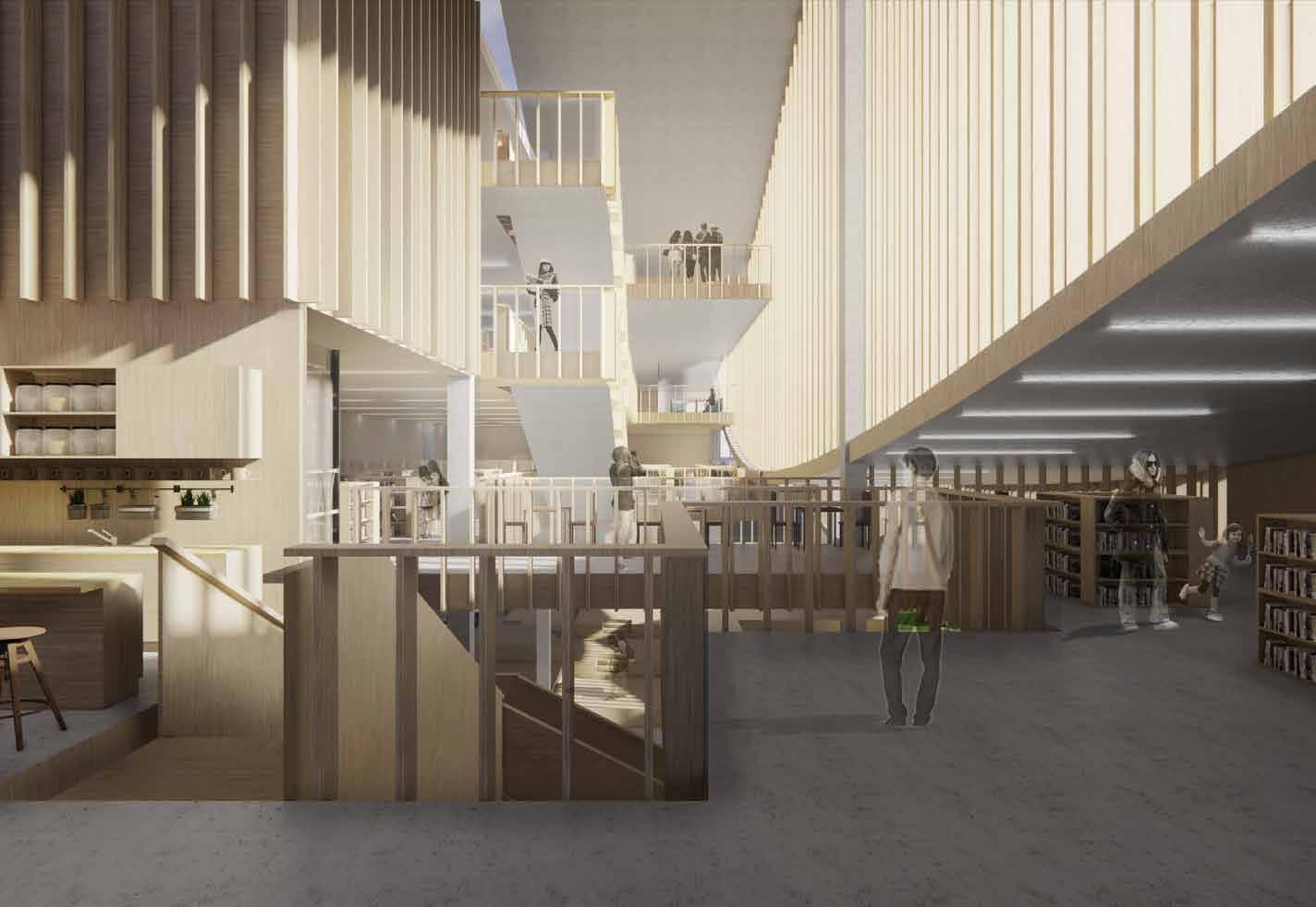 To make the library a people’s place, it provide people a sense of comfort and belongingness to the neighborhood they live in. Large two story high artrium on the first level enhances some the quality principles: light, space, gather, reading, leisure. These are people in the crowded North Bund region desire and the library aims to provide through its five-story structure.
