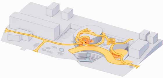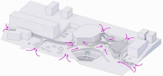 The site’s height differences are pivotal, and the layout adapts to these topographical shifts by creating varied levels for seating and viewing, allowing visitors to engage with environment in multiple ways