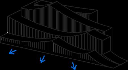 Serving as a pathway between First Street and Ashley Street, the ramps engage with multiple areas such as the theater, plaza, and landscape. As people pass by, they can catch glimpses of movies, choosing whether to pause and watch or continue on their way.
