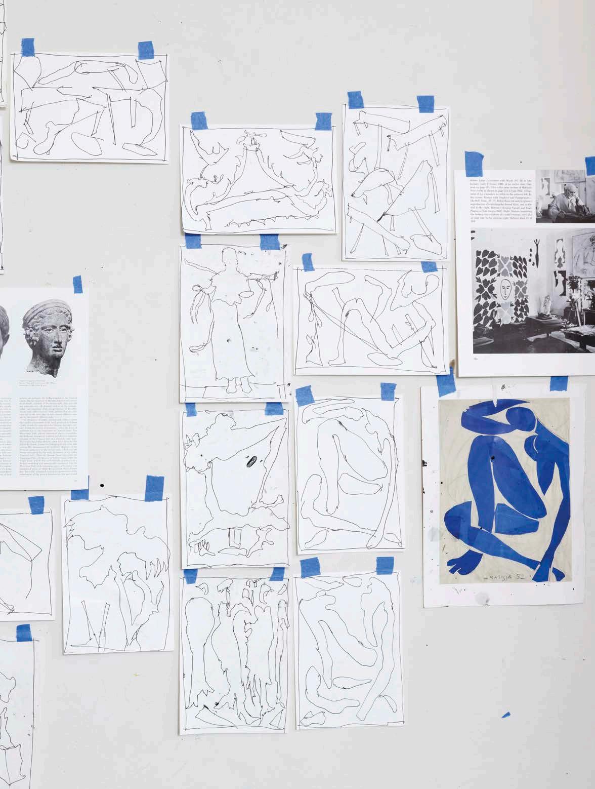 works from the early 2000s and see how forms and compositions have re-emerged. Many of those drawings look like they could be primitive studies for the new work. I also haven’t grown tired of starting a painting simply to see what will happen, where it will go. Whenever I’ve thought the end was looming, I’ve been surprised the next day by my own excitement at the effect of some new tool, a subtle change in composition or new choice of silhouette.