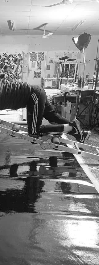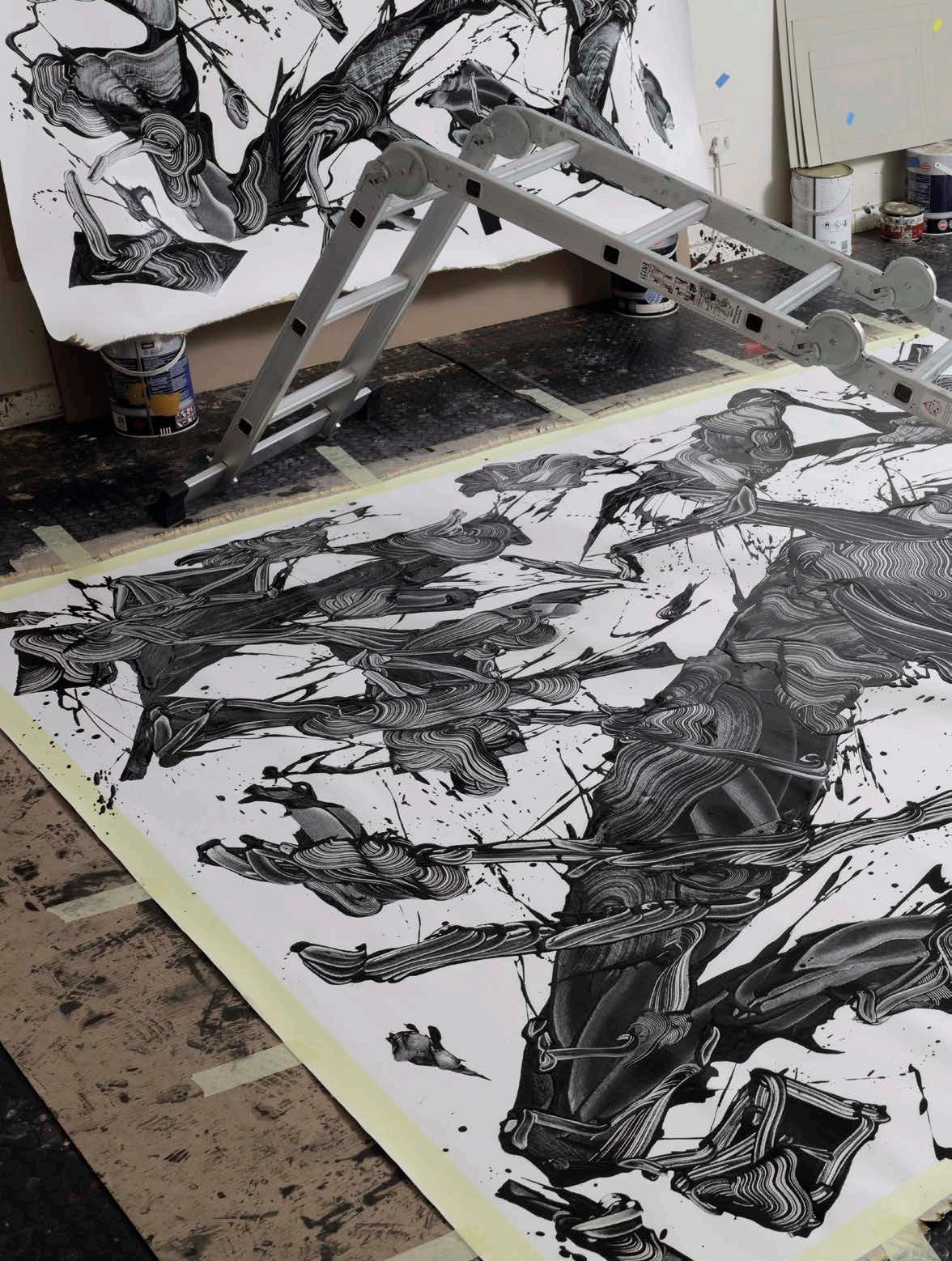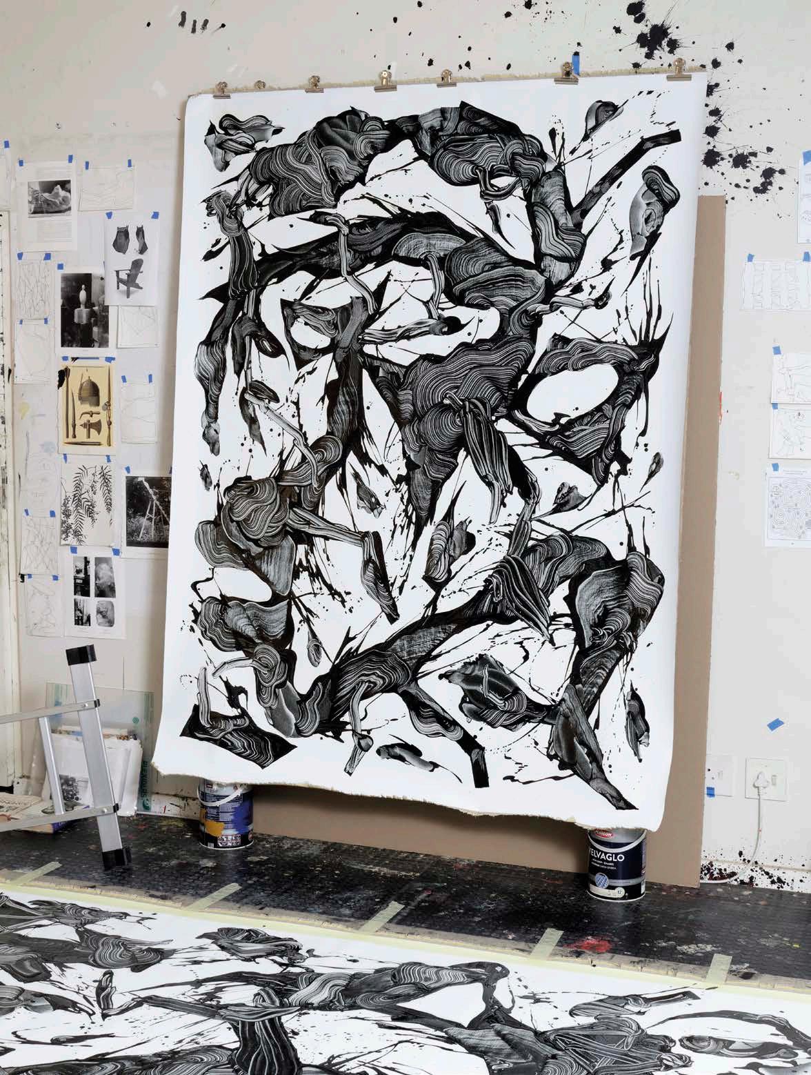 to be sculpted out of the black pools of paint. The tools essentially function as erasers that reveal the original white surface of the linen.