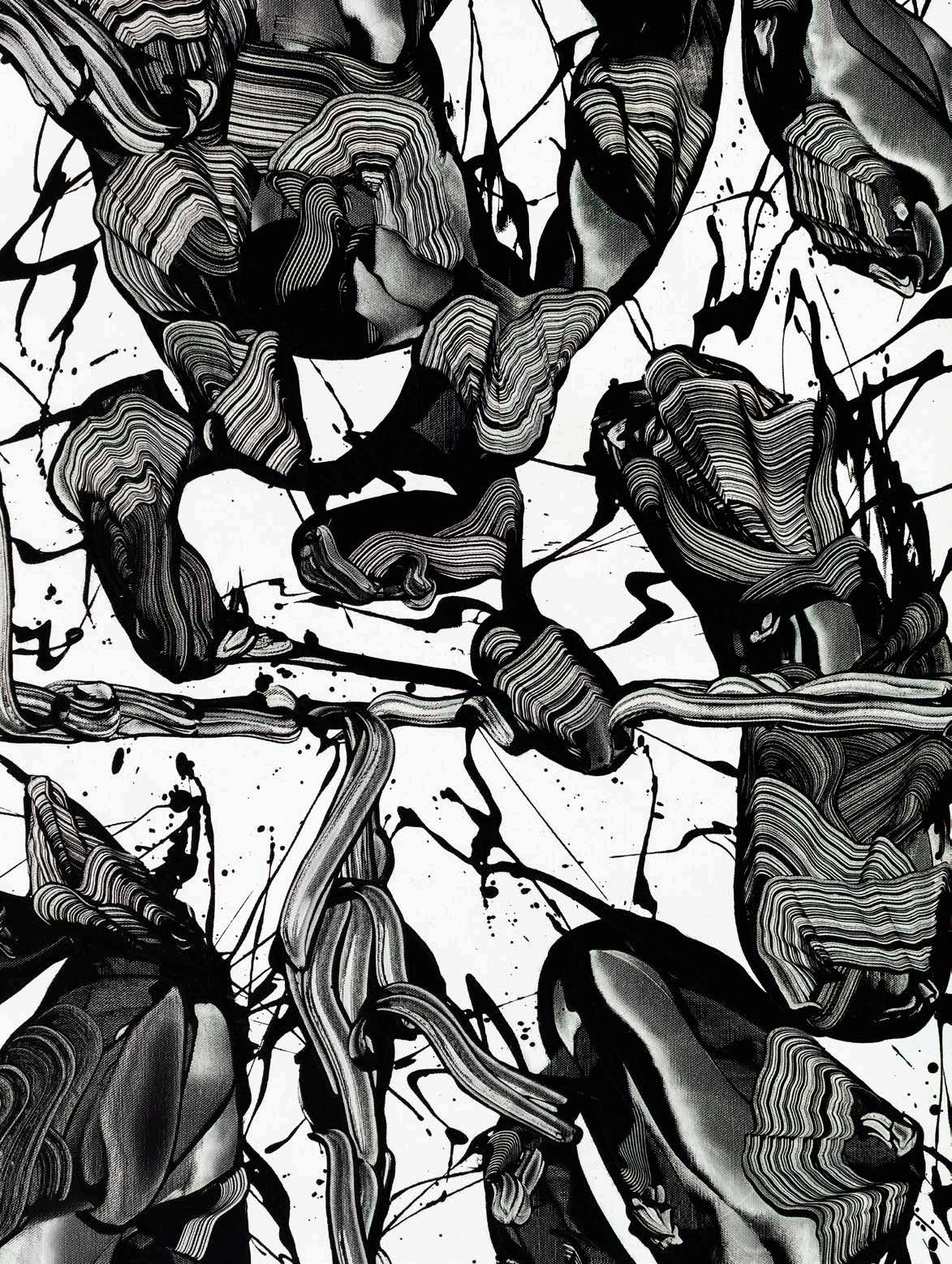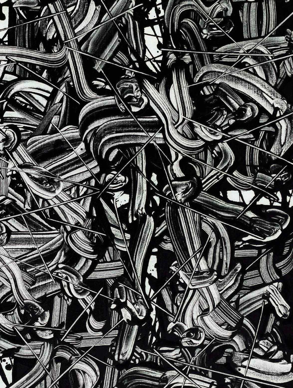 The basic method is as follows: paint black shapes in oil with brushes on unstretched white-acrylic-primed linen, flat on the floor or table. Then work into the shape/s with rubber, steel and (especially) silicone tools while the paint is wet. This is the core of the trick, the technique that enables the illusionistic mark-making. These tools bring back the white surface of the canvas to varying degrees, each with different effect, and each subtle change in the movement or