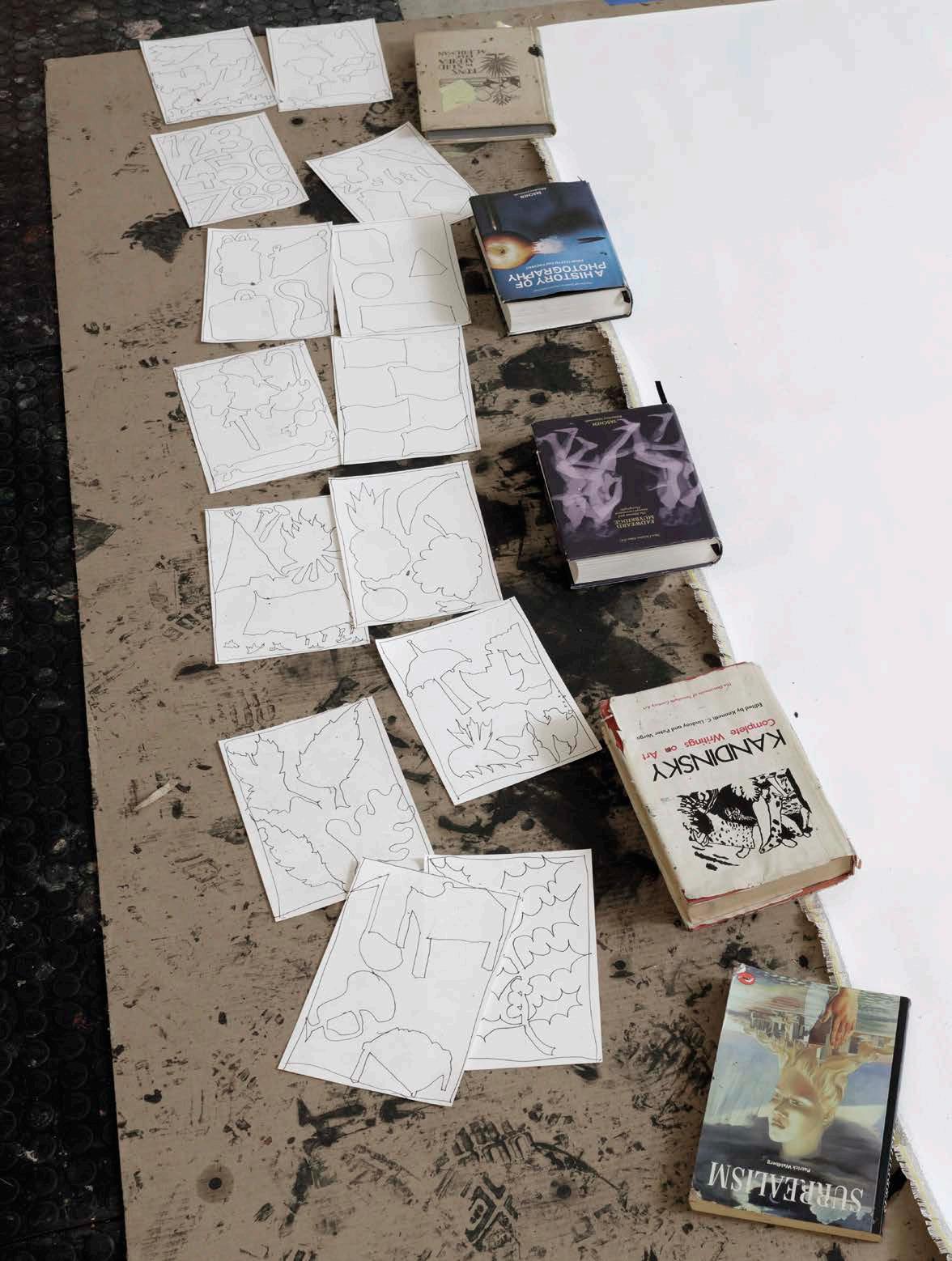 and games/task books to be a wonderful and deep well for strange and unexpected arrangements of form. Once I’ve made a loose and distorted sketch of the reference, I don’t look back at it again. Then from the sketch I draw the outline/silhouette very lightly with charcoal on the canvas. Here things get distorted again and another step removed. So by the time I get to a finished painting it will be almost unrecognisable from the original source. This process is about creating a scenario where I can go in with confidence and commit to certain forms when I begin, just to have a little bit of direction. Once you have this basic form down you can start manipulating and twisting it to your will. Often I’ll have a big empty canvas lying on the floor for days, brooding over how to start, deciding on a reference and then at the last minute choosing something completely different.