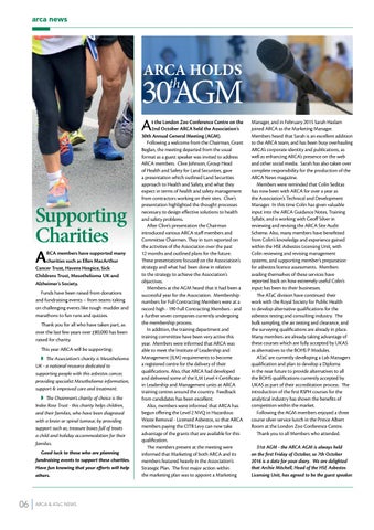 t the London Zoo Conference Centre on the 2nd October ARCA held the Association’s 30th Annual General Meeting (AGM). Following a welcome from the Chairman, Grant Beglan, the meeting departed from the usual format as a guest speaker was invited to address ARCA members. Clive Johnson, Group Head of Health and Safety for Land Securities, gave a presentation which outlined Land Securities approach to Health and Safety, and what they expect in terms of health and safety management from contractors working on their sites. Clive’s presentation highlighted the thought processes necessary to design effective solutions to health and safety problems. After Clive’s presentation the Chairman introduced various ARCA staff members and Committee Chairmen. They in turn reported on the activities of the Association over the past 12 months and outlined plans for the future. These presentations focused on the Association’s strategy and what had been done in relation to the strategy to achieve the Association’s objectives. Members at the AGM heard that it had been a successful year for the Association. Membership numbers for Full Contracting Members were at a record high - 190 Full Contracting Members - and a further seven companies currently undergoing the membership process. In addition, the training department and training committee have been very active this year. Members were informed that ARCA was able to meet the Institute of Leadership and Management (ILM) requirements to become a registered centre for the delivery of their qualifications. Also, that ARCA had developed and delivered some of the ILM Level 4 Certificate in Leadership and Management units at ARCA training centres around the country. Feedback from candidates has been excellent. Also, members were informed that ARCA has begun offering the Level 2 NVQ in Hazardous Waste Removal - Licensed Asbestos, so that ARCA members paying the CITB Levy can now take advantage of the grants that are available for this qualification. The members present at the meeting were informed that Marketing of both ARCA and its members featured heavily in the Association’s Strategic Plan. The first major action within the marketing plan was to appoint a Marketing