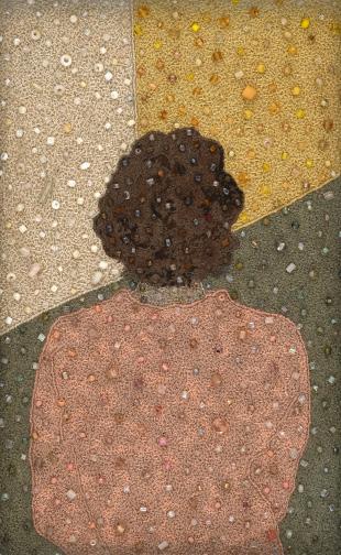 (The Silence Beyond Human Endeavor) of embroidered and beaded pieces of women alone, faceless figures. - a conversation about the illusions created by social media and the cultural insisthe constant evaluation of our worth based on being looked at and being part of another, that existence from birth to death.