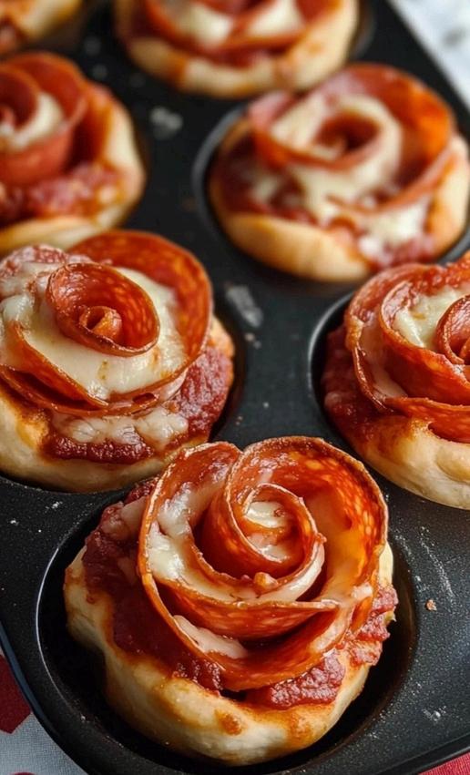 Roll into roses: Carefully roll each strip of dough into a tight rose shape. Make sure the ends are tucked underneath so the pizza rose stays intact during baking. Place in muffin tin: Gently place each rolled pizza rose into a muffin tin. The dough will fit snugly in the muffin cup, creating a perfect rose shape. Bake: Place the muffin tin in the preheated oven and bake for 12-15 minutes