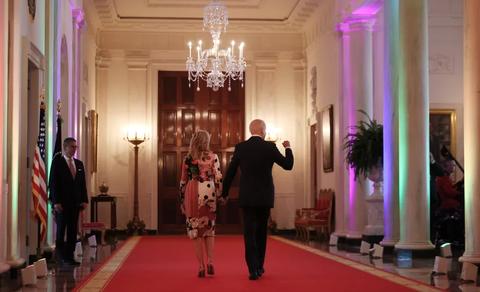 President Biden and first lady Jill Biden walk through the Cross Hall of the White House lit with rainbow colors following a Pride Month event in the East Room last year.