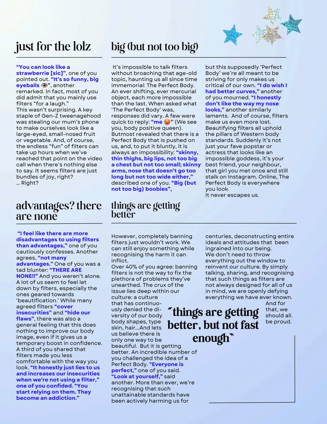 Maybewespeakformanyofyouwhenwesaythatweoften forgethowprivilegedwearetohavethatopportunitytospeak andshare.It’ssoeasytotakesomethingso‘basic’forgranted. That’swhywebelieve“OurLives,OurVoices”istheperfect themeforthisedition,onewhichwerealisedunintentionally chroniclesarangeofallourjoysandstrugglesasyoung peopleandgirls.Becauseitdoesn’tmatterwhetherwe're speakingoutaboutthecatcallingwefaceonthestreets, expressinghownavigatingtheever-impossiblemazeofbeauty standardsmakesusfeel,orevenjustravingaboutthemusic albumsofthemoment,we’reallconstantlygivingvoicetoour lives.Whatmakesuslaugh,whatmakesuscry–ourwhole, full-onInsideOut2setofadolescentemotions.