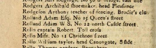 Rogerson was clearly doing well for himself since his arrival and was listed in Thomas Aitchison’s ‘Edinburgh Directory’ of 1797 and 1799, by which time he had relocated to Brodie’s Close (possibly named after Francis Brodie, father to the notorious thief, William) Baxter’s Close had, by this time, been purchased by the council ‘to clear the way for Bank Street and North Bank Street’ (BOEC, vol XII, p.14). Aitchison’s ‘Directory’ listed all town officials, magistrates, and included an ‘Alphabetical Arrangement of the Names and Places of Abode of Private Gentlemen, Advocates, Writers to the Signet, Merchants, Tradesmen’ Hoi Polloi most definitely not included
