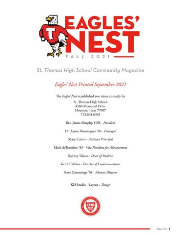St. Thomas High School Community Magazine Eagles’ Nest Printed September 2021 The Eagles’ Nest is published two times annually by St. Thomas High School 4500 Memorial Drive Houston, Texas 77007 713.864.6348 Rev. James Murphy, CSB - President Dr. Aaron Dominguez ’96 - Principal Mary Criaco - Assistant Principal Mark deTranaltes ’83 - Vice President for Advancement Rodney Takacs - Dean of Students Keith Calkins - Director of Communications Steve Cummings ’08 - Alumni Director KH Studio - Layout + Design