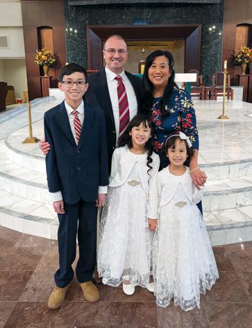 Mrs. Thuy Tracy, who joined the Saint Henry faculty in 2023, was raised in a Catholic family. Her great-aunt was a religious sister at St. John’s in Worcester, Mass. Of special note, her family is related to one of the Vietnamese Martyrs, Father Peter Qui Cong Doan! Tom grew up in a home where God was spoken about, but his family did not attend worship on a weekly basis. As an adult, he began attending non-denominational churches around the Bellevue area. Thuy shared, “We began to feel the pull of having Tom and the kids baptized soon after starting school at Saint Henry. We kept this thought in our hearts and prayers, and earlier this school year Talia (2nd grade) came home from school and confidently stated that she wanted to be baptized.” This set the ball in motion.