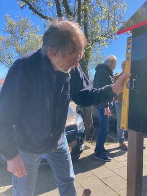 Op de achterkant van het XL insectenhotel hangt een vitrine voor aankondigingen van activiteiten op het plein en in de wijk, allereerst de uitnodiging voor het Lentefeest. Feestelijk opgehangen door wethouder Tanja de Jonge, die het insectenhotel officieel opende