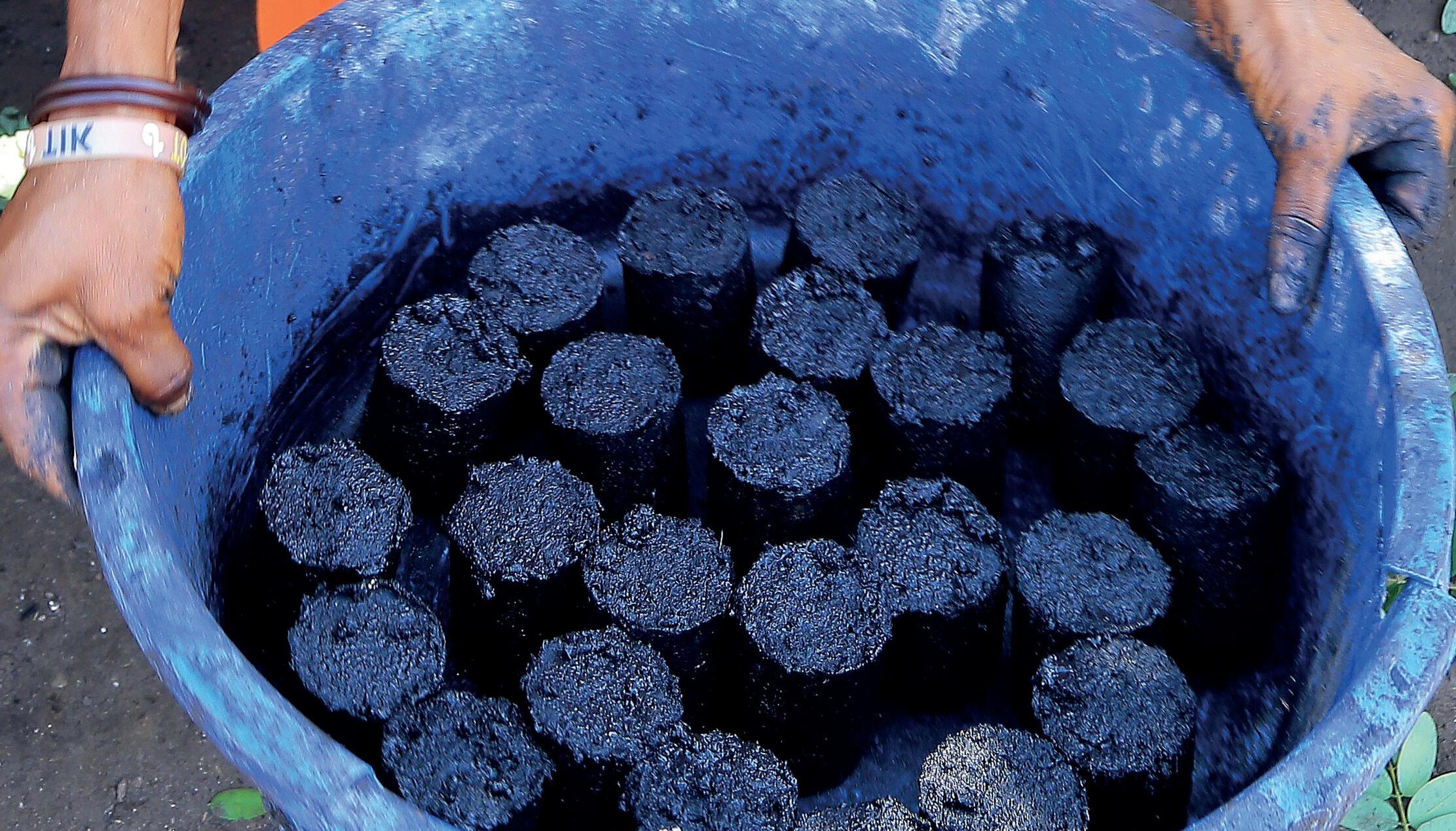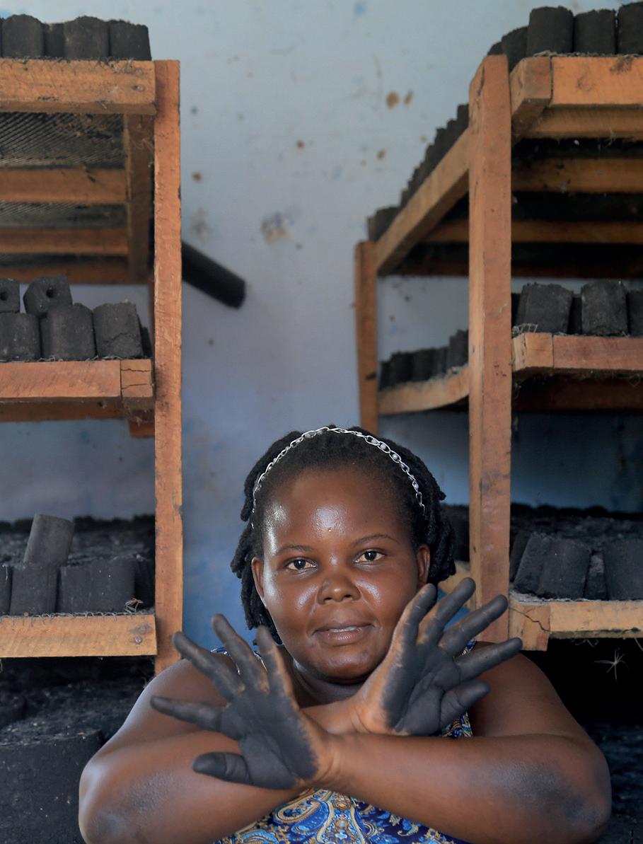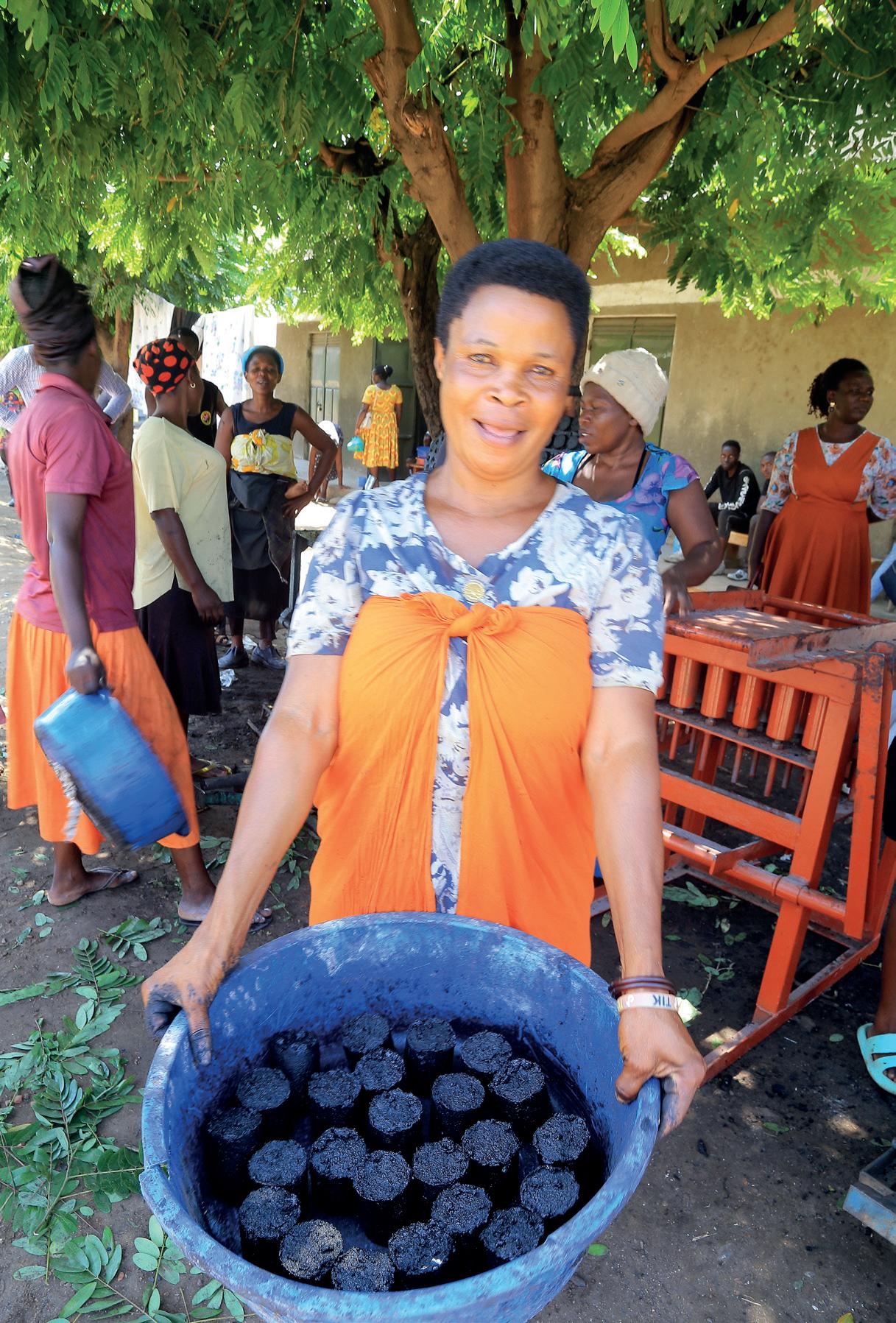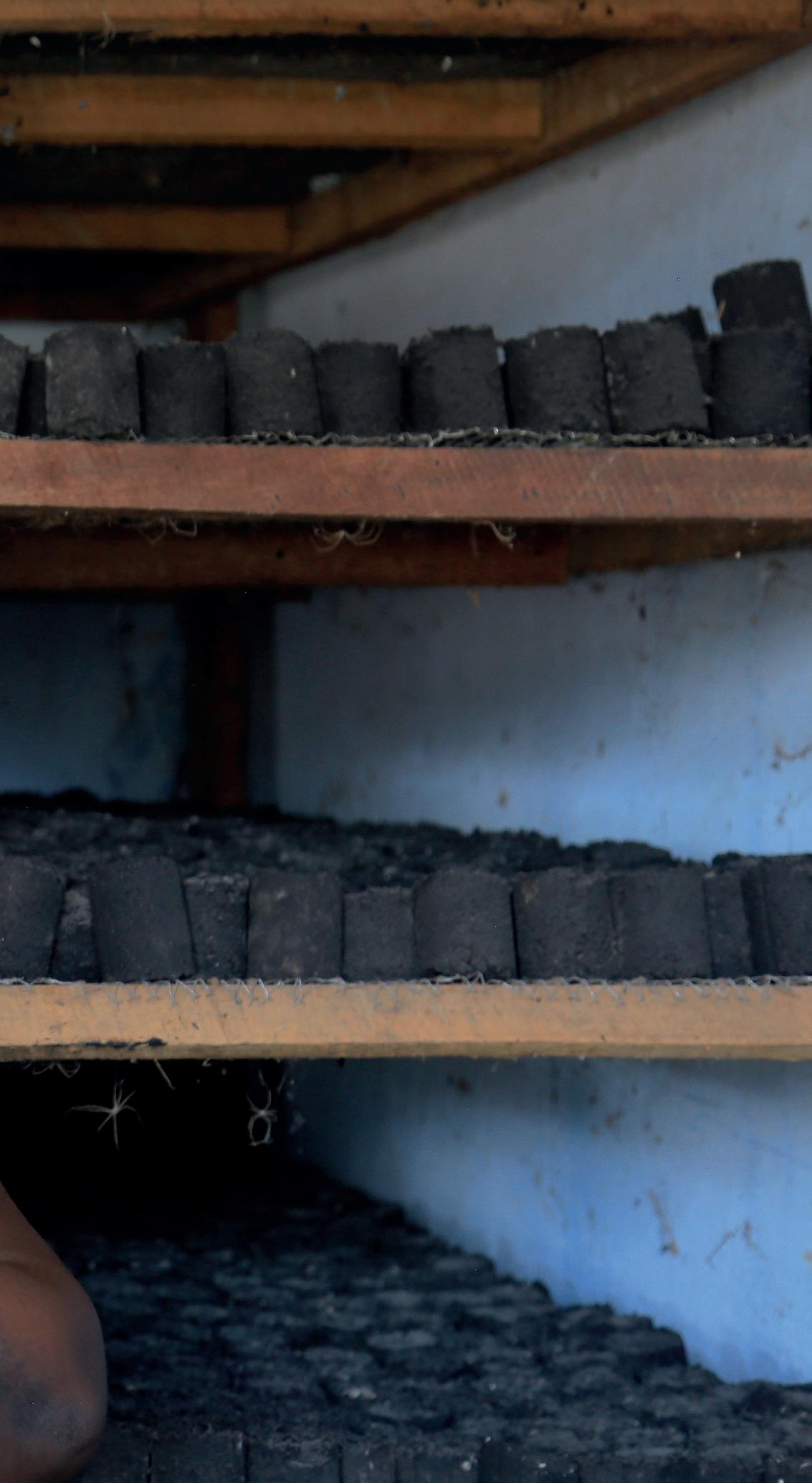 VROUWEN ONTDEKT HOE ZE VAN GFT-AFVAL BRIKETTEN KUNNEN MAKEN OM HUN KOOKVUREN MEE TE BRANDEN. DAARMEE SPAREN ZE HET KOSTBARE OERWOUD, BEPERKEN ZE DE UITSTOOT VAN SCHADELIJKE STOFFEN ÉN