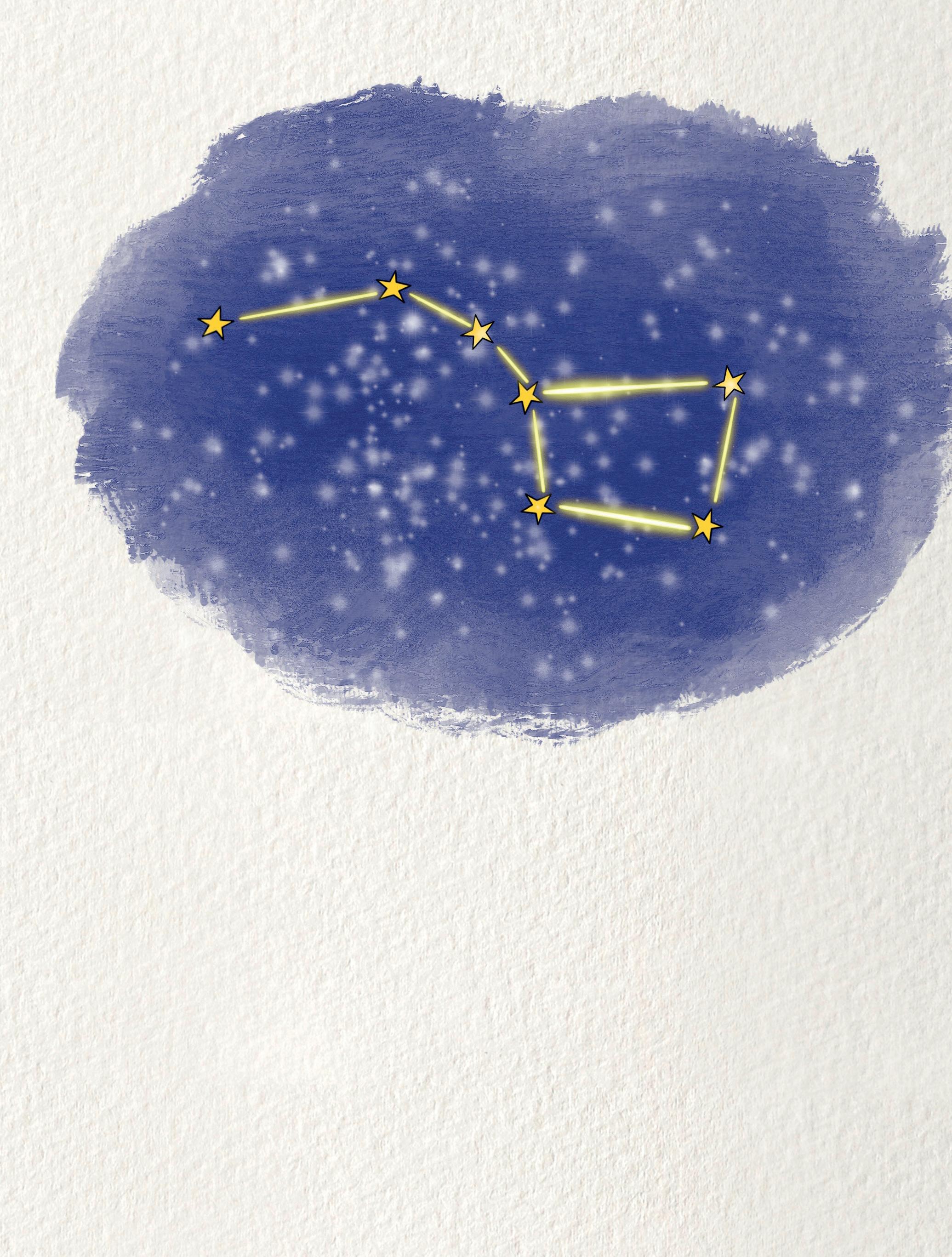 ‘Ja, of de grote Beer. Zo noemen ze het ook wel. Kijk!’ De vader van Bas wijst de zeven heldere sterren aan die samen de vorm van een steelpan