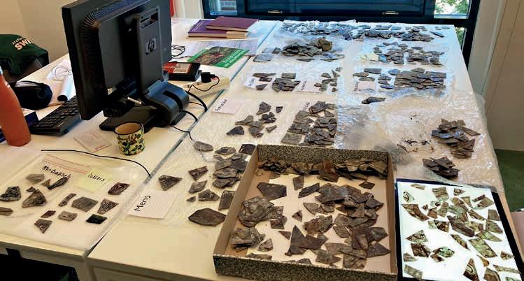 Glasfragmenten in de jaren ’70 gevonden tijdens het opschonen van de grachten rondom het voormalige premonstratenzer vrouwenklooster Nijenklooster (ten zuiden van Krewerd). Foto auteur.