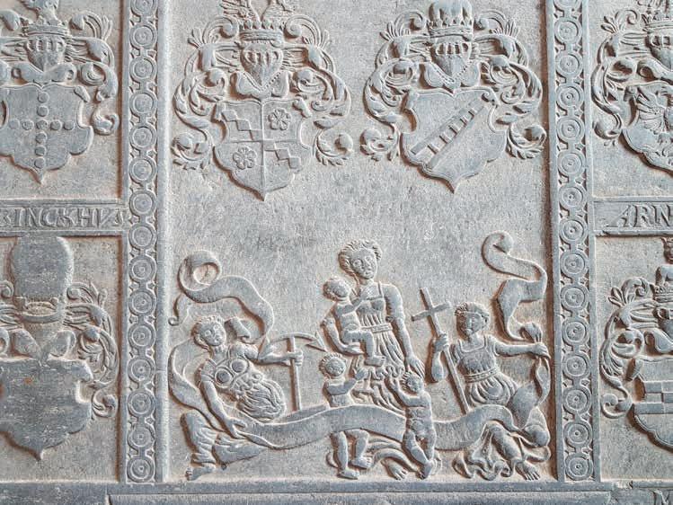 Deze ‘freule van Munster’ moeten we zoeken in de bewoningsgeschiedenis van de borg Ten Ham (ook wel Duirsum) bij Loppersum. 3 Bawina Heemster († 1540) was gehuwd met Roelof van Munster. Hun gelijknamige zoon huwde Maria van Selbach († 1576). De grafzerken van Bawina en haar schoondochter bevinden zich nog steeds in de Lopster kerk.4 Zou het feit dat twee van de vrouwen in de allegorische voorstell ing op Maria’s zerk het haar in een vlecht dragen de aanleiding zijn geweest om juist haar onderwerp te maken van de mythe?