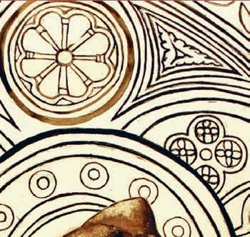 Voorbeeld van een gestandaardiseerd brandschilderpatroon met wijnbladmotief afkomstig uit de kathedraal van Soissons, Frankrijk, 1270-1280. Uit: Jane Hayward, English and French medieval stained glass in the collection of the Metropolitan Museum of Art, dl. 1 (London/Turnhout 2003) 226.