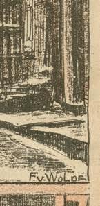 Kees van der Ploeg voorzi�er redactie Patt y Wageman Gezicht op de remonstrantse kerk vanuit de Herepoortenmolendrift. Tekening voor een kalender uit 1917 door F. van Wolde. Collectie Groninger Archieven (1536-3610).
