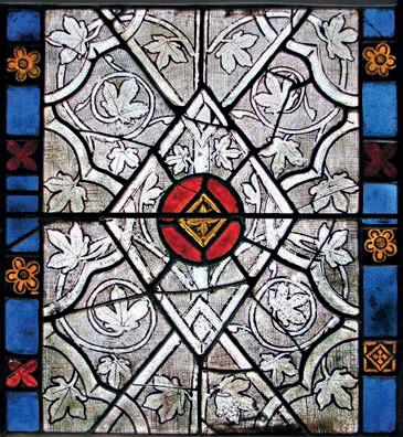 in het loodwerk of door ramen met gestandaardiseerde patronen zoals het wijnbladmotief.