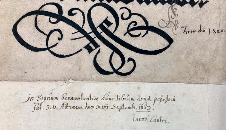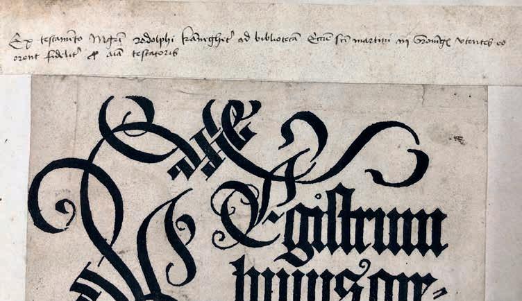 plaar is gefragmenteerd, maar bewaard is onder meer het gedeelte waarop iemand aan het begin van de zestiende eeuw in het Latijn heeft geschreven: ‘Uit het testament van meester Rodolphus Kannegheter aan de bibliotheek van de Sint-Maartenskerk in Groningen. Wie het gebruikt, moet getrouw bidden voor de ziel van de testateur.’ 5 Zonder deze aantekening zouden we niet weten dat dit boek ooit eigendom was van Rodolphus Kannegheter.