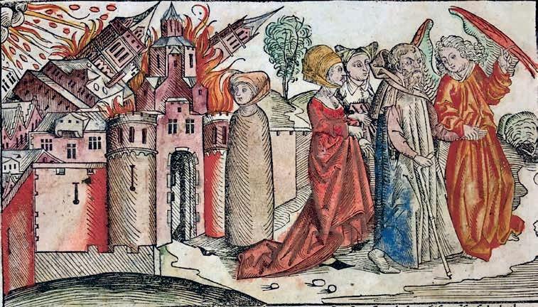 ‘We openen als het ware een nieuw venster op onze collectie.’↑ Houtdruk die de ondergang van Sodom en Gomorra verbeeldt; ook inkleuring is een vorm van tastbaar bewijs, omdat dit handmatig per exemplaar gebeurde. Collectie UB Groningen (INC 163, fol. 21r).