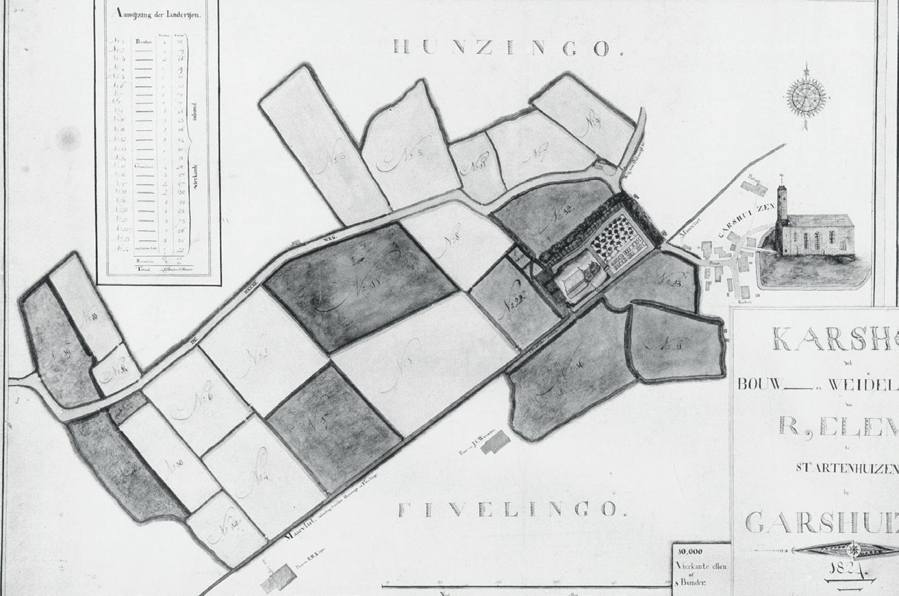 De middeleeuwse kerk van Garsthuizen op een kaart uit 1824. Collectie Groninger Archieven (818-4143).