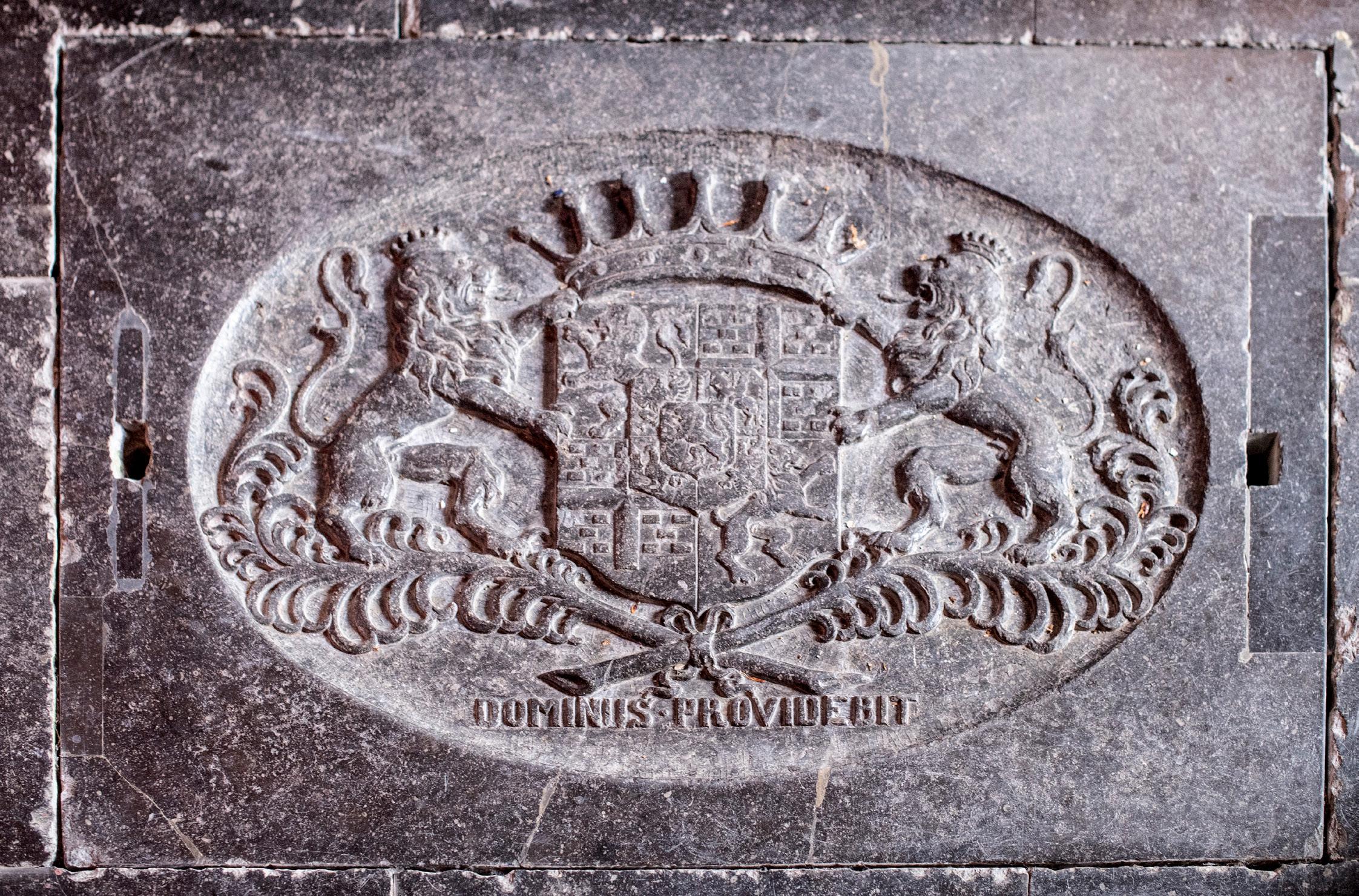 ↗ Deksteen van de grafkelder in de kerk van Midwolde. De wapenspreuk is die van Georg Wilhelm von Inn- und Kniphausen (1635-1709) maar de letters doen recenter aan, evenals de weergegeven rangkroon voor een baron (met zeven parelpunten). Mogelijk is de steen vernieuwd bij het herstel van de grafkelder in 1814. Foto Duncan Wijting.