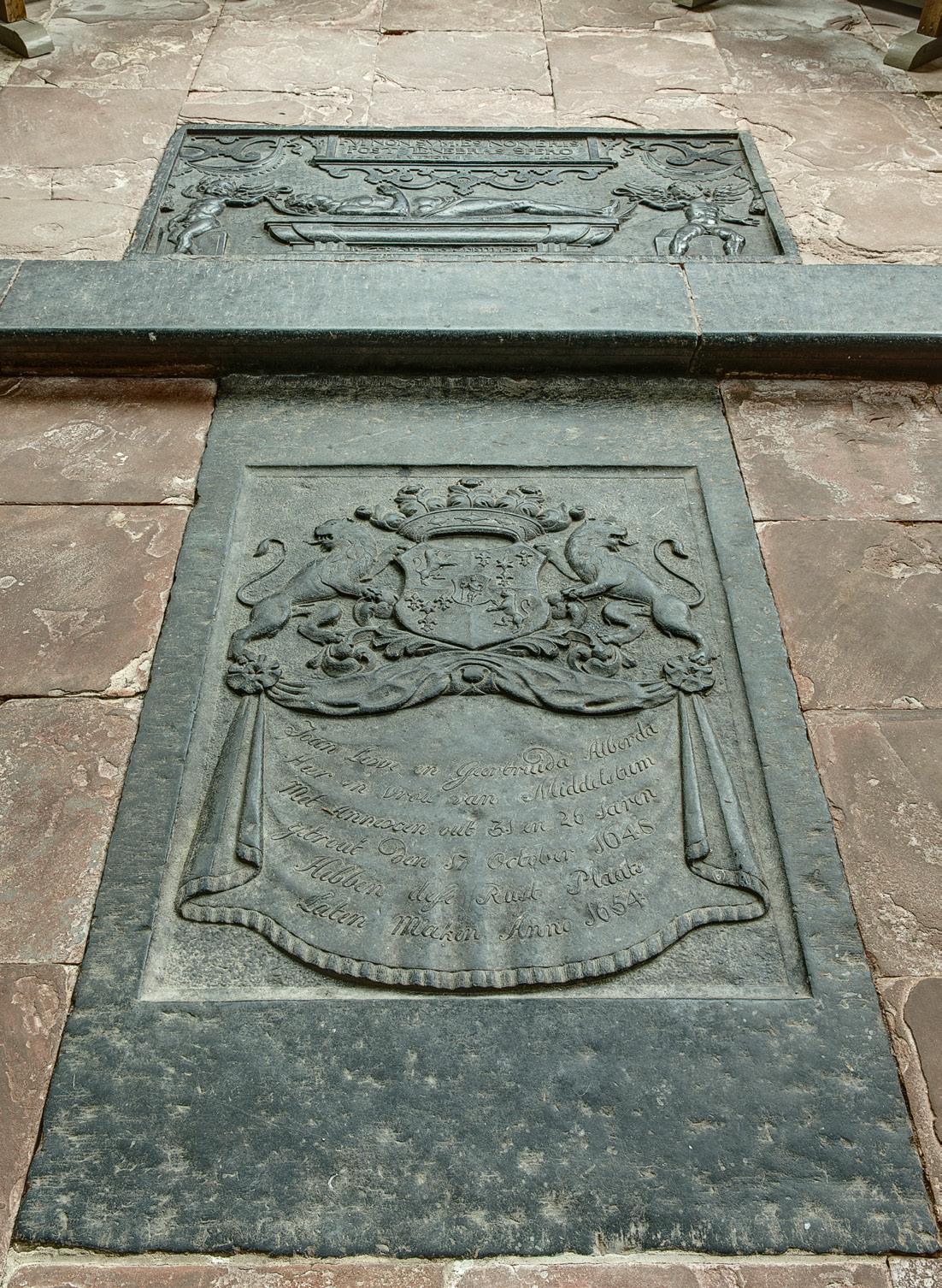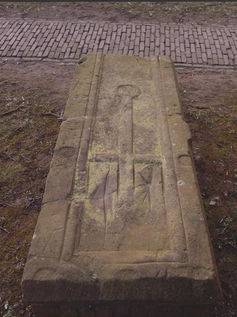 ← Deksteen van de grafkelder van de Hippolytuskerk van Middelstum. De steen lag van het midden van de 18e eeuw tot 1916 op het kerkhof van Toornwerd. Door inspanningen van wethouder en amateurhistoricus Jacob Vinhuizen verhuisde deze weer naar de oorspronkelijke plaats. Foto Omke Oudeman.