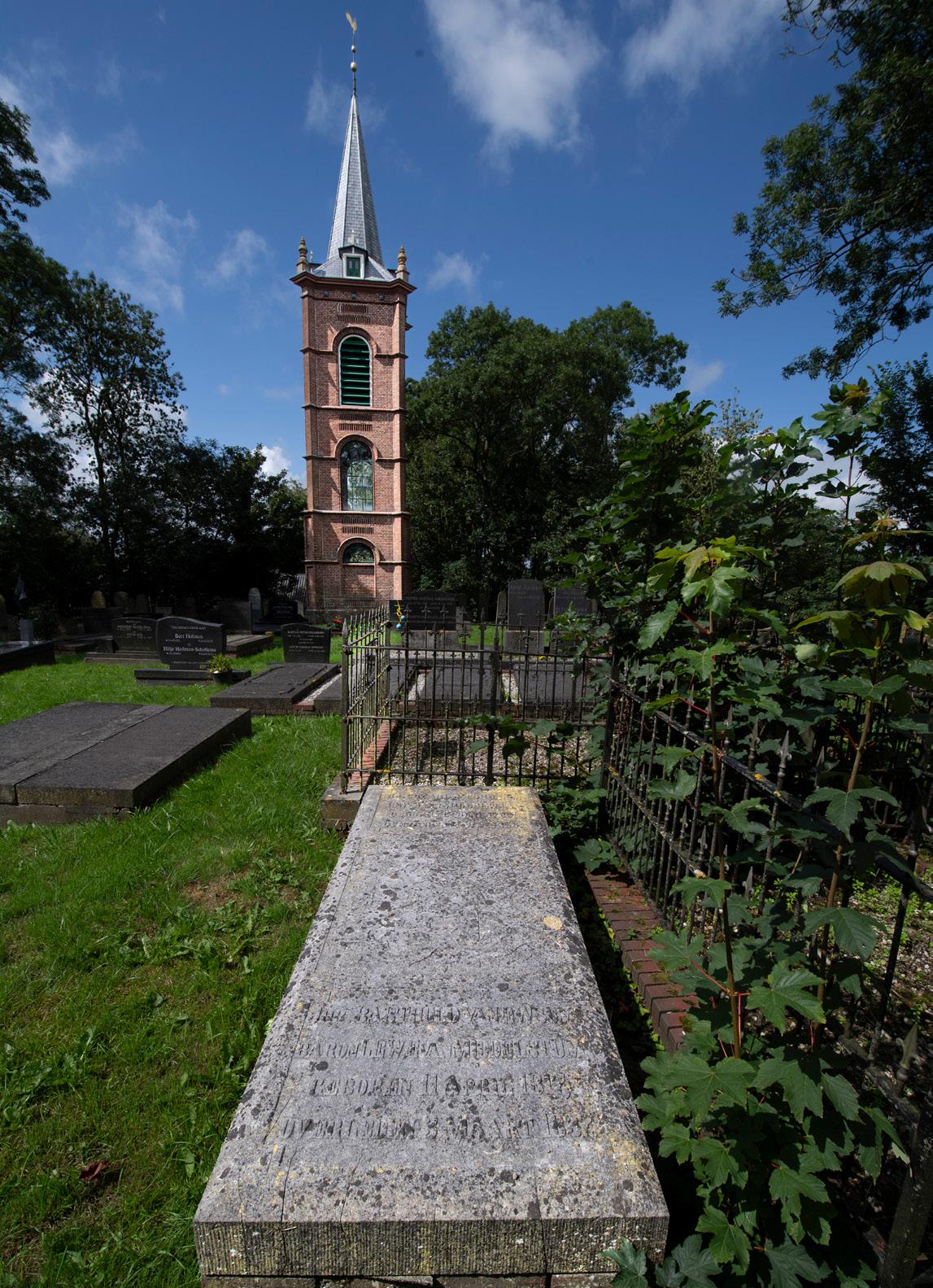 van Rensuma (1754-1829) een half jaar na de invoering van het begraafverbod. Zijn vrouw was in 1781 al overleden, nazaten had het echtpaar niet. Voor hem werd een graf gemetseld op het kerkhof, ongeveer op drie meter afstand van de deur van het koor (waaronder de familiegrafkelder). Een klein ‘naamzerkje’ duidde de plek van zijn laatste rustplaats aan. Het opschrift daarvan was binnen een eeuw als gevolg van ‘afschuifeling door de kerkgangers’ al onleesbaar geworden. 29 Inmiddels is het afgesleten steentje zelfs helemaal verdwenen. Het zou een aardige geste zijn om voor iemand die in het algemeen belang de regels naleefde óók eens een steenhouwer aan het werk te zetten.