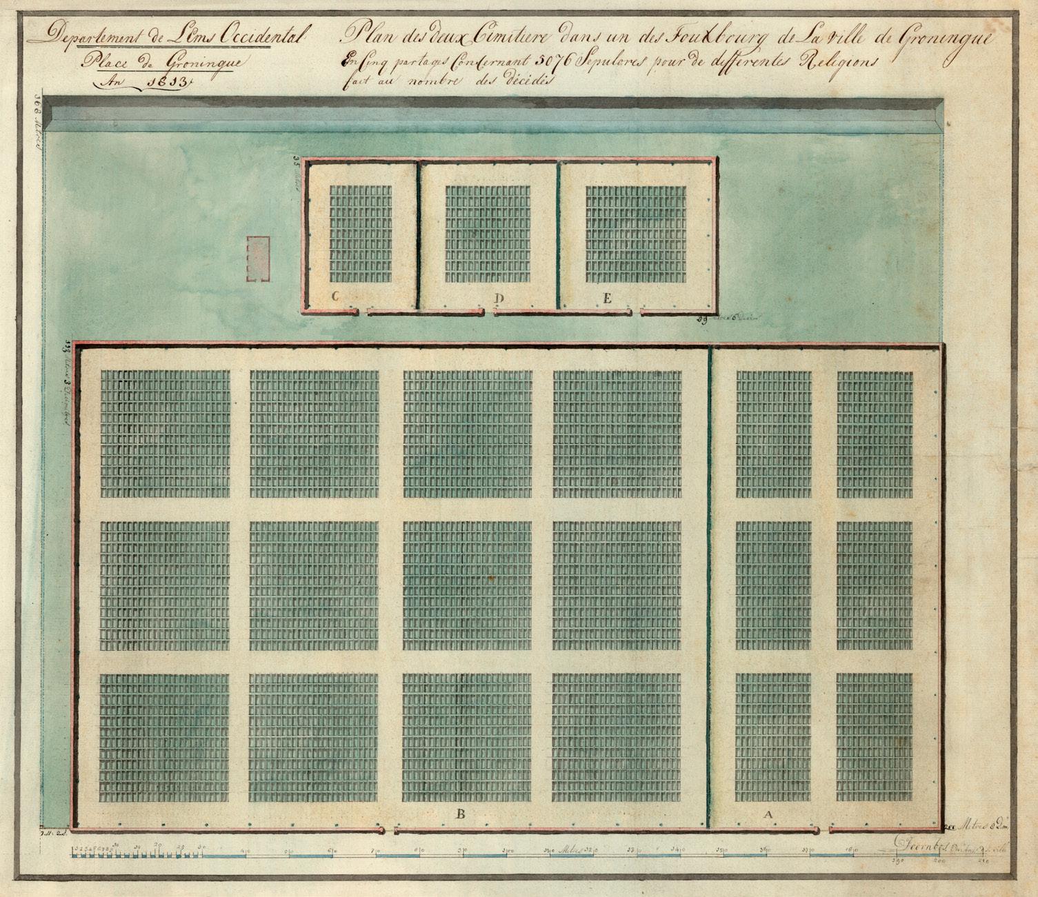 Jacobus Doornbos (1755-1824) een plan voor twee buiten de stadswallen (‘dans un des Fauxbourg’) aan te leggen begraafplaatsen. In totaal zouden ze ruimte moeten bieden aan 5076 graven.