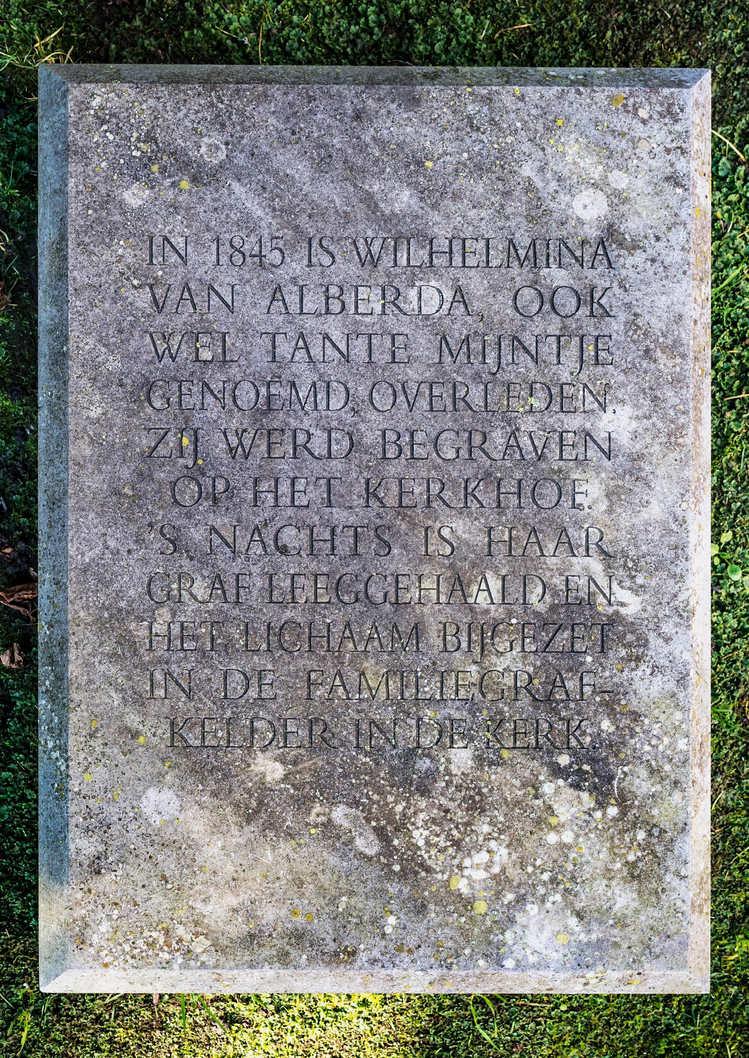 Op het kerkhof van Pieterburen ligt een merkwaardige gedenksteen. Het opmerkelijke zit vooral in het gegeven dat deze de aandacht vestigt op een strafbaar feit: Wilhelmina Jeanne Alberda van Menkema, bewoonster van de borg Dijksterhuis, is in 1845 in de kerk begraven terwijl dit al sinds 1 januari 1829 niet meer toegestaan was. Haar nabestaanden waren niet de enigen die het verbod opvatten als een ‘dode letter’. Bijzettingen in het kerkgebouw vonden vooral kort na de invoering van de wetgeving nog plaats, figuurlijk om vijf over twaalf dus. Dat laatste gold ook in letterlijke zin.