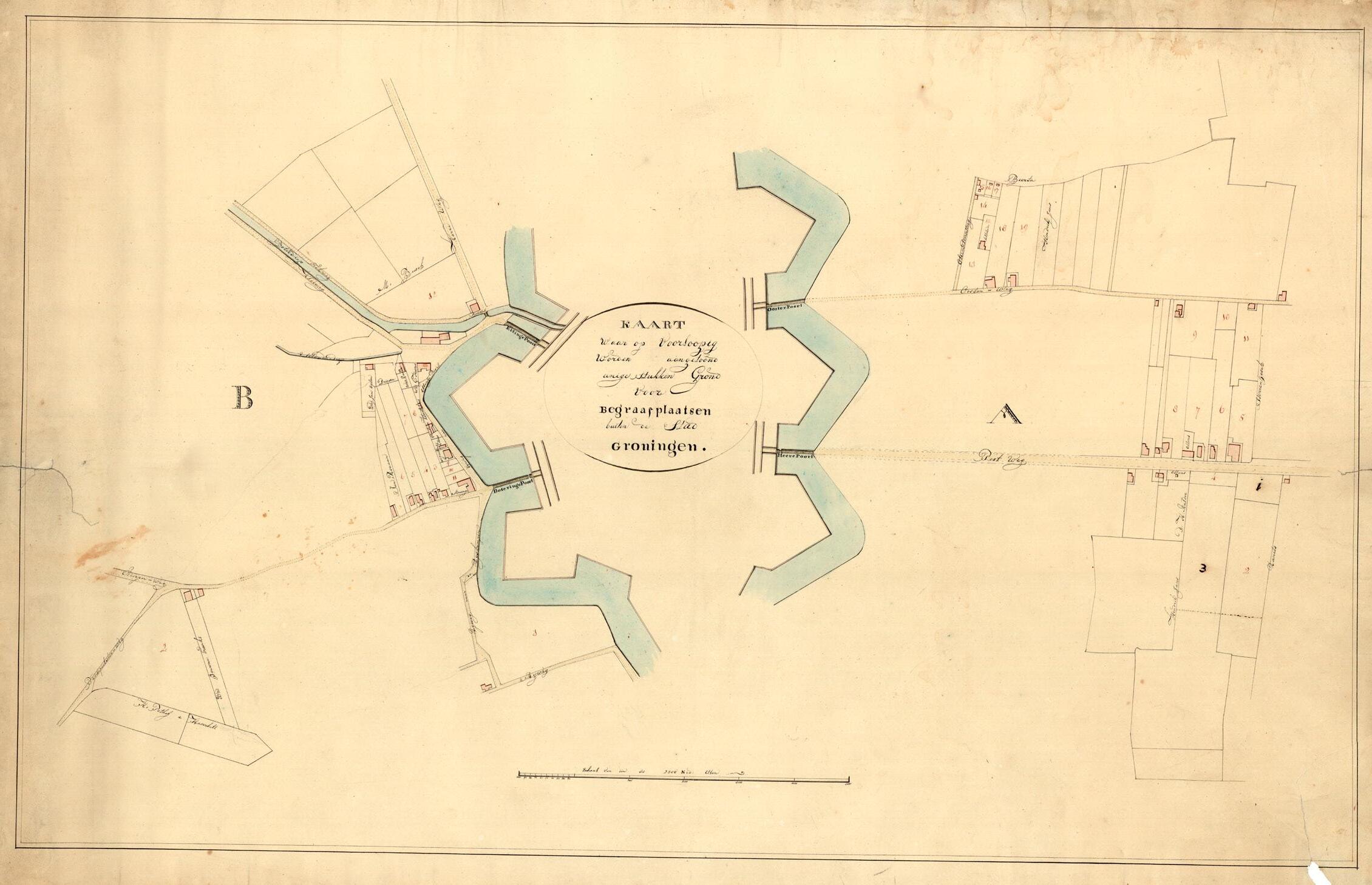 Situatieschets van de buiten de stadswallen aan te leggen Noorder- en Zuiderbegraafplaats in Groningen, 1826. Collectie Groninger Archieven (1536-6024).