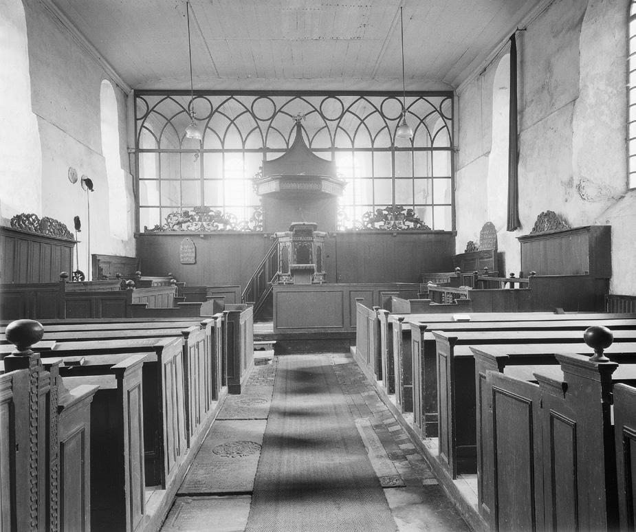 ↑ De kerk van Wirdum met grafzerken in het middenpad, 1958. De banken aan weerszijden zijn bij een restauratie omstreeks 1960 opgeruimd. Collectie Rijksdienst voor het Cultureel Erfgoed, foto G.Th. Delemarre.