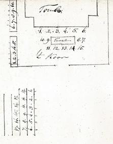 → 6. Grondplan uit 1821 met te huren zitplaatsen op het koor en schip (het gedeelte tegenover de niet-ingetekende kansel).