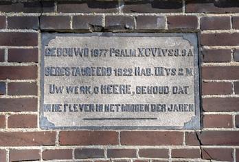 ↘ Plaquette in de zuidmuur van de kerk links van de ingang, in 1953 aangebracht ter herinnering aan de Abel Janszoon Tasman, ontdekker van Tasmanië en Lutjegasts bekendste inwoner. Even hardnekkig als onjuist is het verhaal dat Tasman geboren werd op de Tassemaheerd. Foto Peter de Kan.