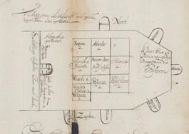 ← Kaartje van ‘’t choor van Lutkegast met glasen, legersteden ende gestoelten’. De plattegrond, aanwezig in een dossier van de Hoge Justitiekamer uit 1753, is een kopie van het uit 1641 daterende origineel. Collectie Groninger Archieven.