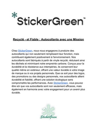 Chez StickerGreen, nous nous engageons à produire des autocollants qui non seulement remplissent leur fonction, mais contribuent également positivement à l'environnement. Nos autocollants sont fabriqués à partir de vinyle recyclé, réduisant ainsi les déchets et minimisant notre empreinte carbone. Conçus pour la durabilité et la résistance aux intempéries, ils conservent leur qualité même en extérieur, offrant une valeur durable à votre image de marque ou à vos projets personnels. Que ce soit pour des logos, des promotions ou des designs personnels, nos autocollants allient durabilité et fiabilité, offrant une solution écologique sans compromettre les performances. Avec StickerGreen, vous pouvez être sûr que vos autocollants sont non seulement efficaces, mais également en harmonie avec votre engagement pour un avenir plus durable.