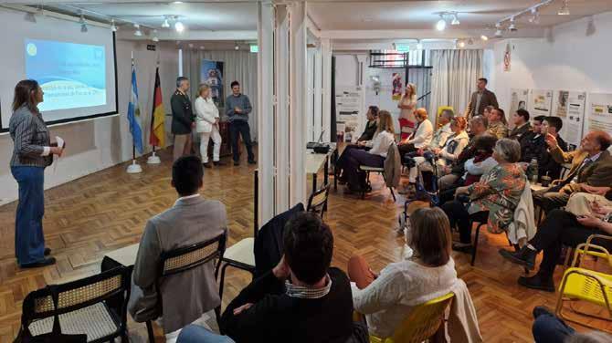 Das dreitägige Projekt in Tandil startete mit der Eröffnung der Wanderausstellung Stolpersteine (siehe S. 16) über Rassismus und Antisemitismus. Im Anschluss hielten Referentinnen und Referenten verschiedene Vorträge über den sozialen Frieden: 1) Das Paradox des Friedens durch Waffen: UN-Friedensoperationen vom argentinischen General Miguel Salguero, 2) Eine Rose für den Frieden über die Züchtung einer besonderen Rose als Friedenszeichen von der Agraringenieurin Jimena Mc Allister, 3) Friedensschaffende Prozesse innerhalb von Kulturinstitutionen über die Wichtigkeit offener Dialogräume innerhalb von Kulturinstitutionen von Gabriel Podevils, Sprecher der Stiftungsinitiative #JungesNetzwerk