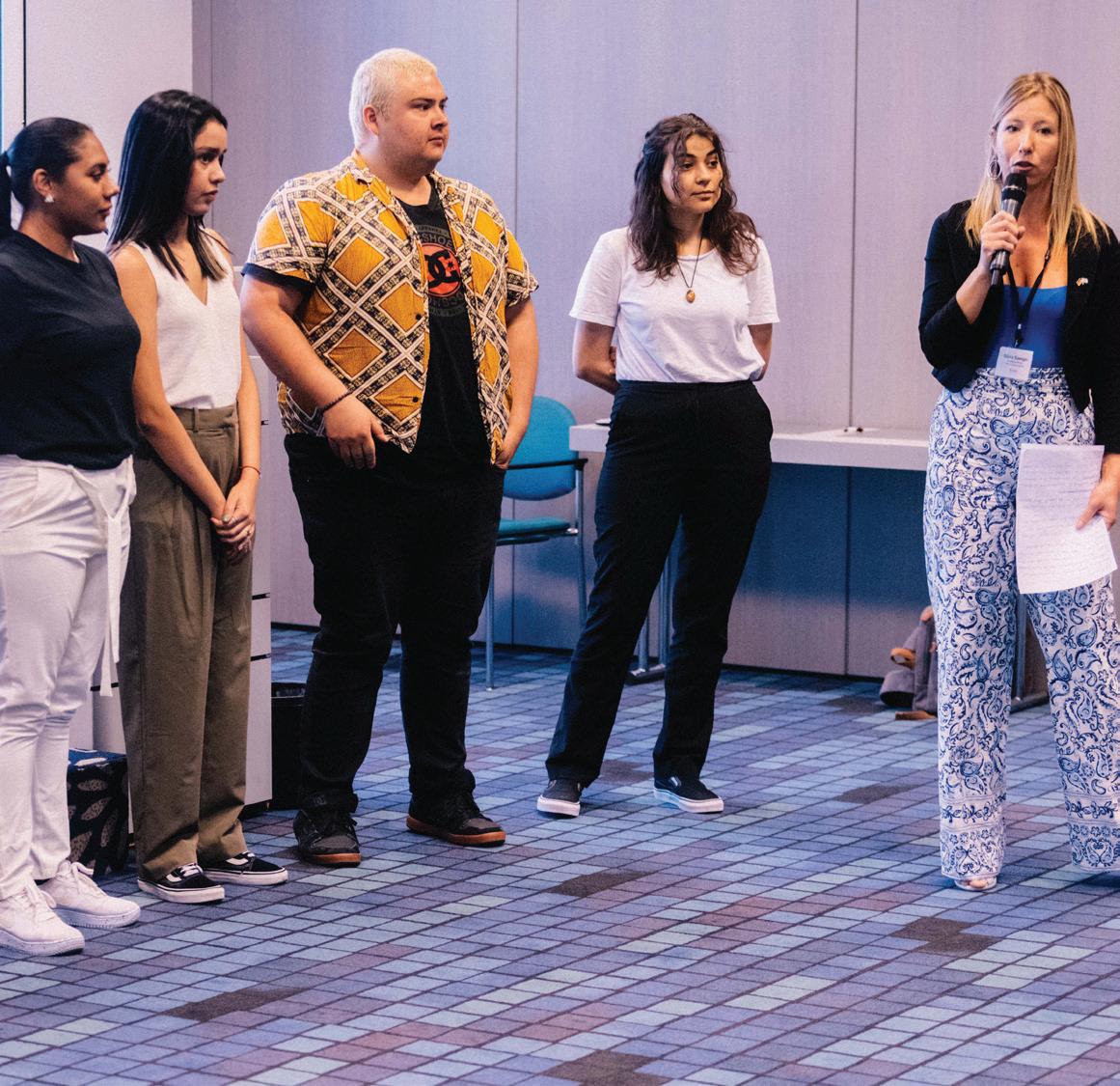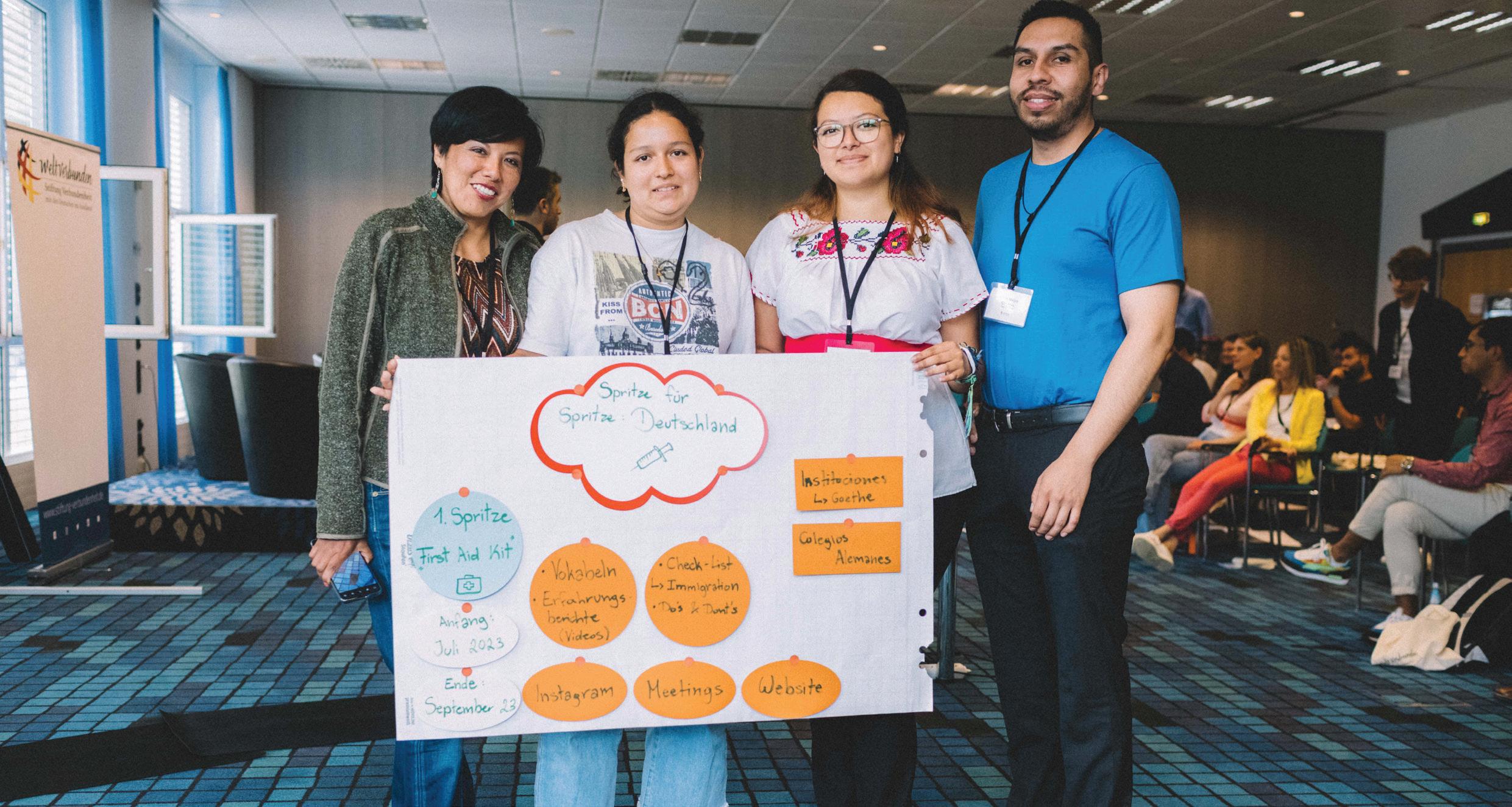 Der letzte Tag startete mit der Begrüßung der Auszubildenden von #JungesNetzwerk profesional, einer Initiative der gemeinnützigen Gesellschaft für Verbundenheit durch Kultur, Bildung und Wirtschaft, die jungen Lateinamerikaner/-innen eine Berufsausbildung in Deutschland im Bereich der Pflege, Heilerziehung und Tourismus ermöglicht. Sechs junge lateinamerikanische Azubis erzählten dabei den Kongressteilnehmer/-innen von ihrem Berufsalltag in Deutschland. Diese wohnten auch der im Anschluss verwirklichten Podiumsdiskussion „Global vernetzt: Internationale Auszubildende, Fachkräfte und Deutschsprachige Gemeinschaften” bei.