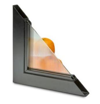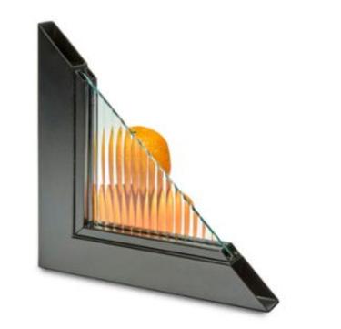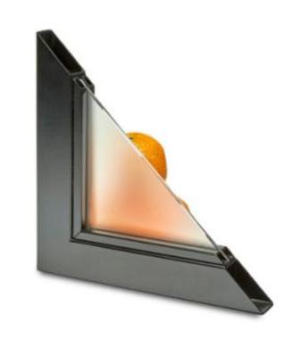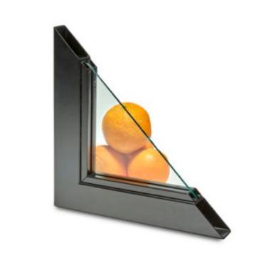 Vårt glass er montert mot fast profil på den ene siden og end avtagbar profil på den andre side Forsenkede skruer sørger for at profilen er flush med rammen Alle kanter på glasset er beskyttet med pakkninger som eliminere vibrasjon og støy .