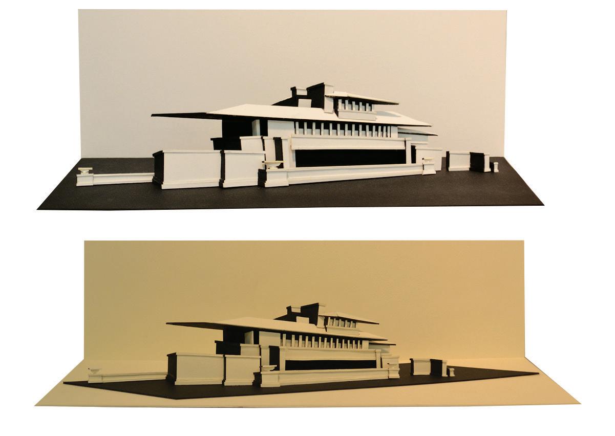 De eerste vormstudie is een overgangsoefening en vormt de brug met de spirituele Japanse cultuur. Twee gebouwen uit het vroege oeuvre van Wright vormen de basis. Naar eigen affiniteit wordt één van beide werken gekozen. Startend vanuit de afbeelding wordt een ruimtelijke voorstelling gevraagd in de derde dimensie, gepresenteerd op een grond- en achtervlak. De bedoeling is geenszins een correct meetkundig model af te leveren, maar wel een voorstelling te creëren die de ruimtelijke continuïteit van het werk evoceert.