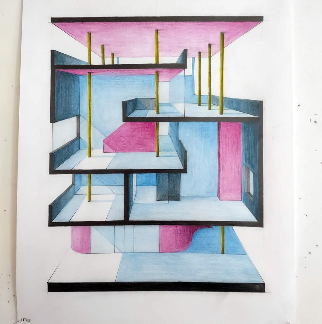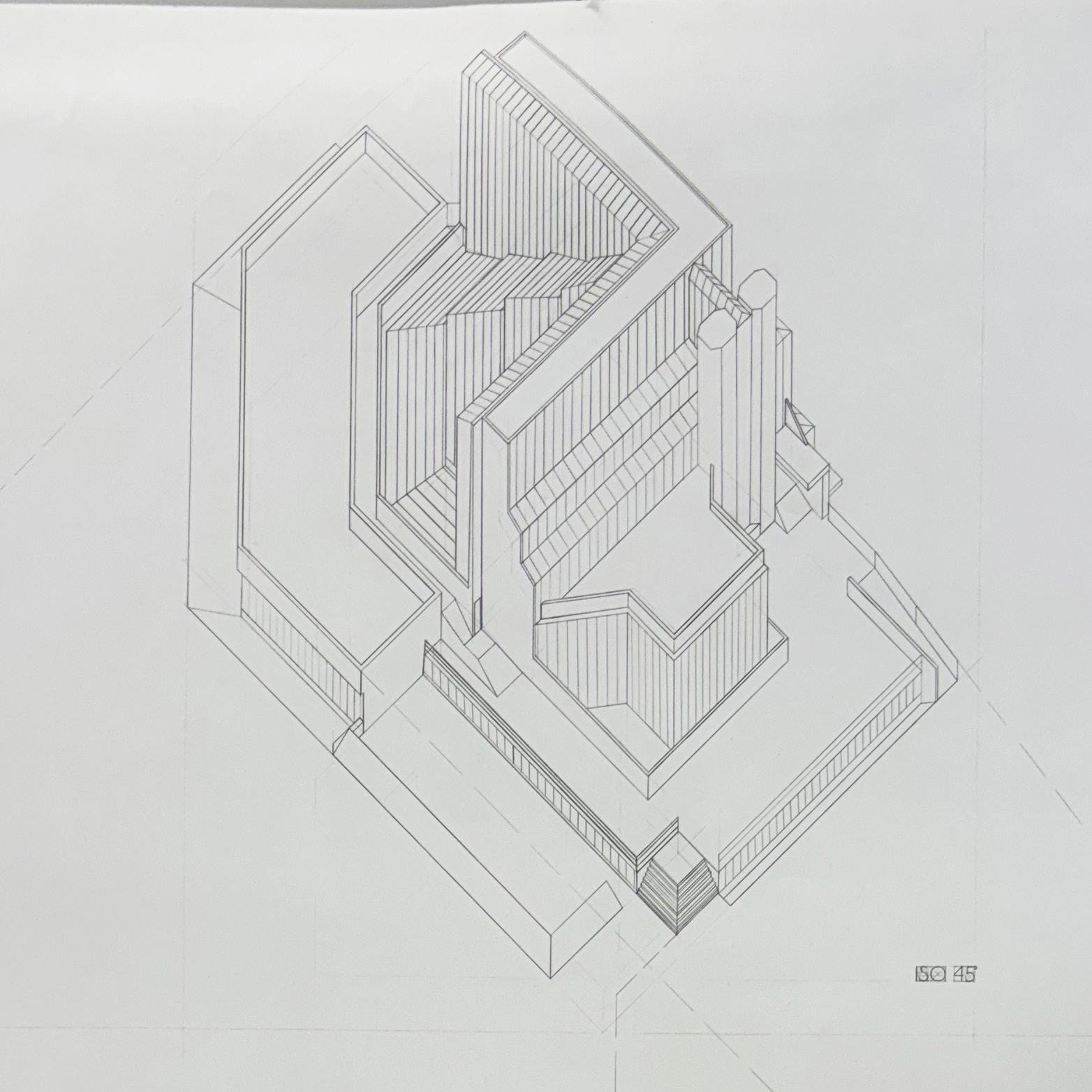 Startende vanuit een tekening en/of foto wordt – na geometrische analyse – een ruimtelijke voorstelling gevraagd, gepresenteerd op een grond- en achtervlak. De bedoeling is om een voorstelling te creëren die de ruimtelijke continuïteit van het gebouw in zijn omgeving evoceert, zowel in zijn detail als in het geheel.