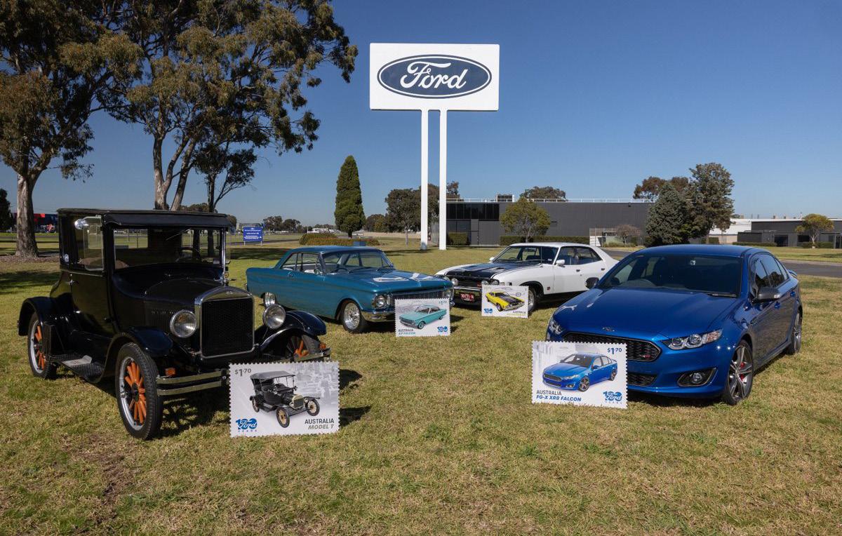 The collection showcases the Model T, XP Falcon, XA Falcon GT, and FG X Falcon XR8, representing a century of Ford’s presence in Australian motoring history. Each stamp carries a face value of $1.70 and includes black-and-white photographs of Ford’s