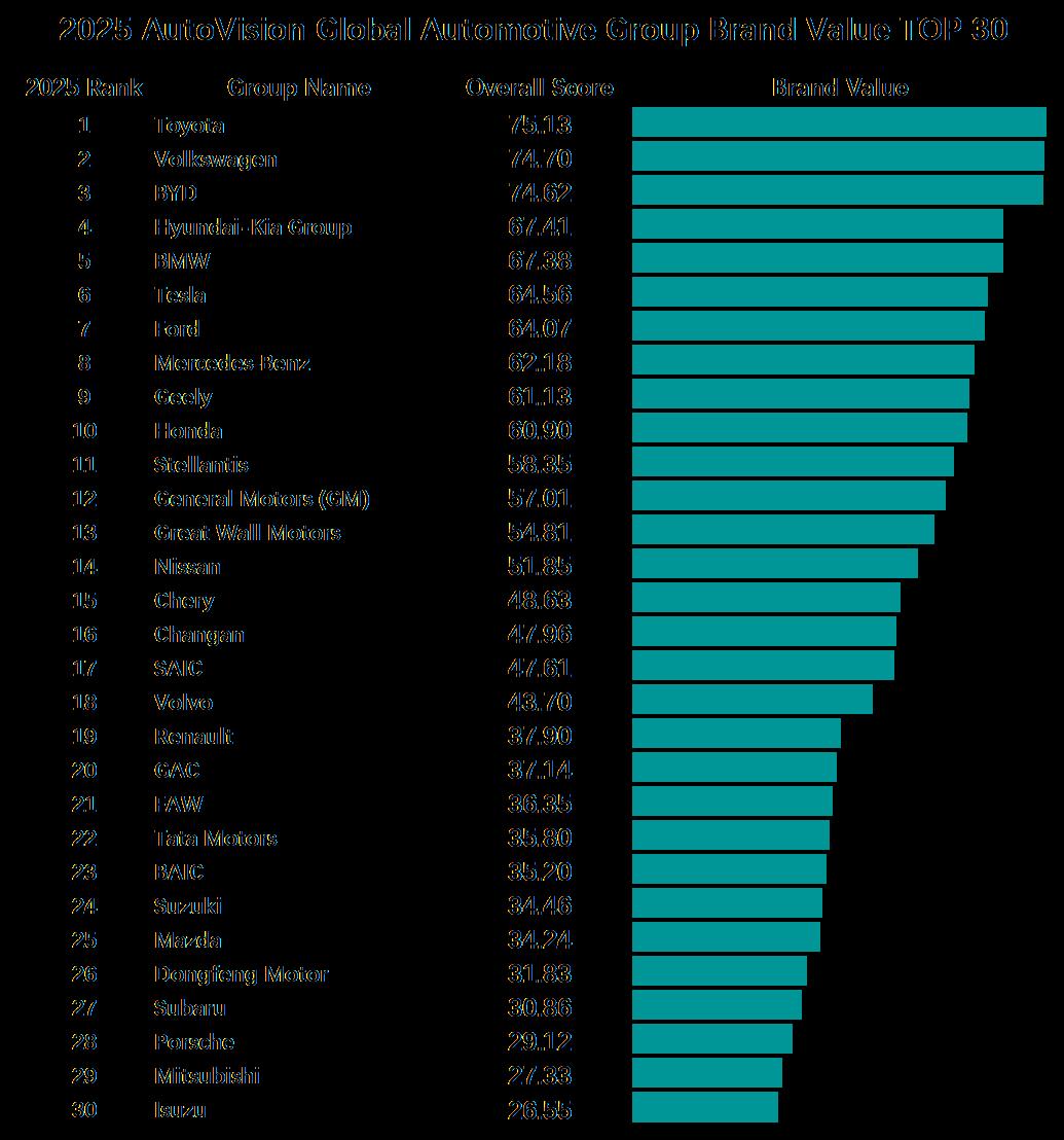 Toyota Group has reclaimed the top position in global automotive brand value rankings, while BYD has become the first Chinese brand to reach the top three, according to the 2025 AutoVision Global Automotive Brand Value Evaluation Report.