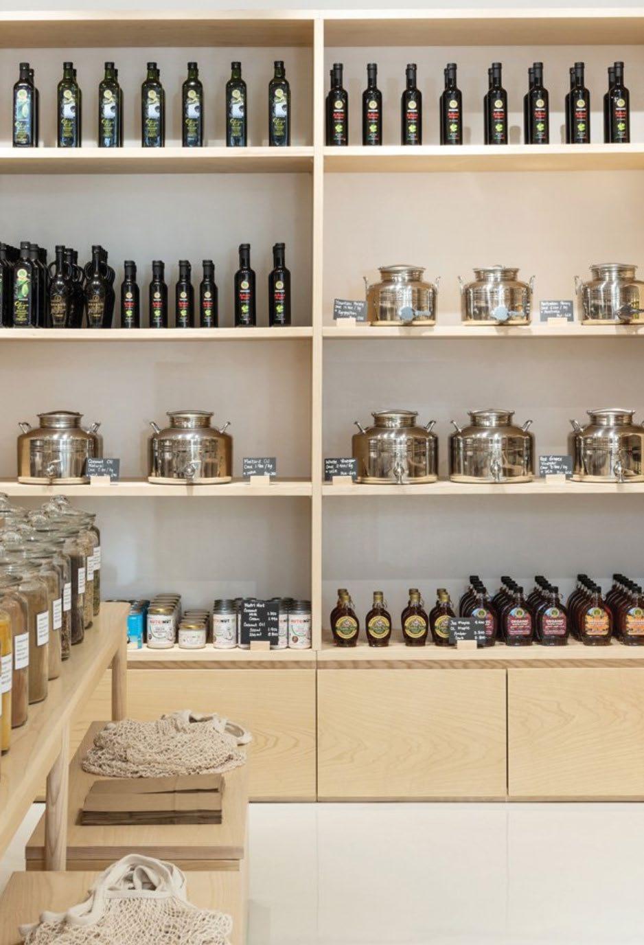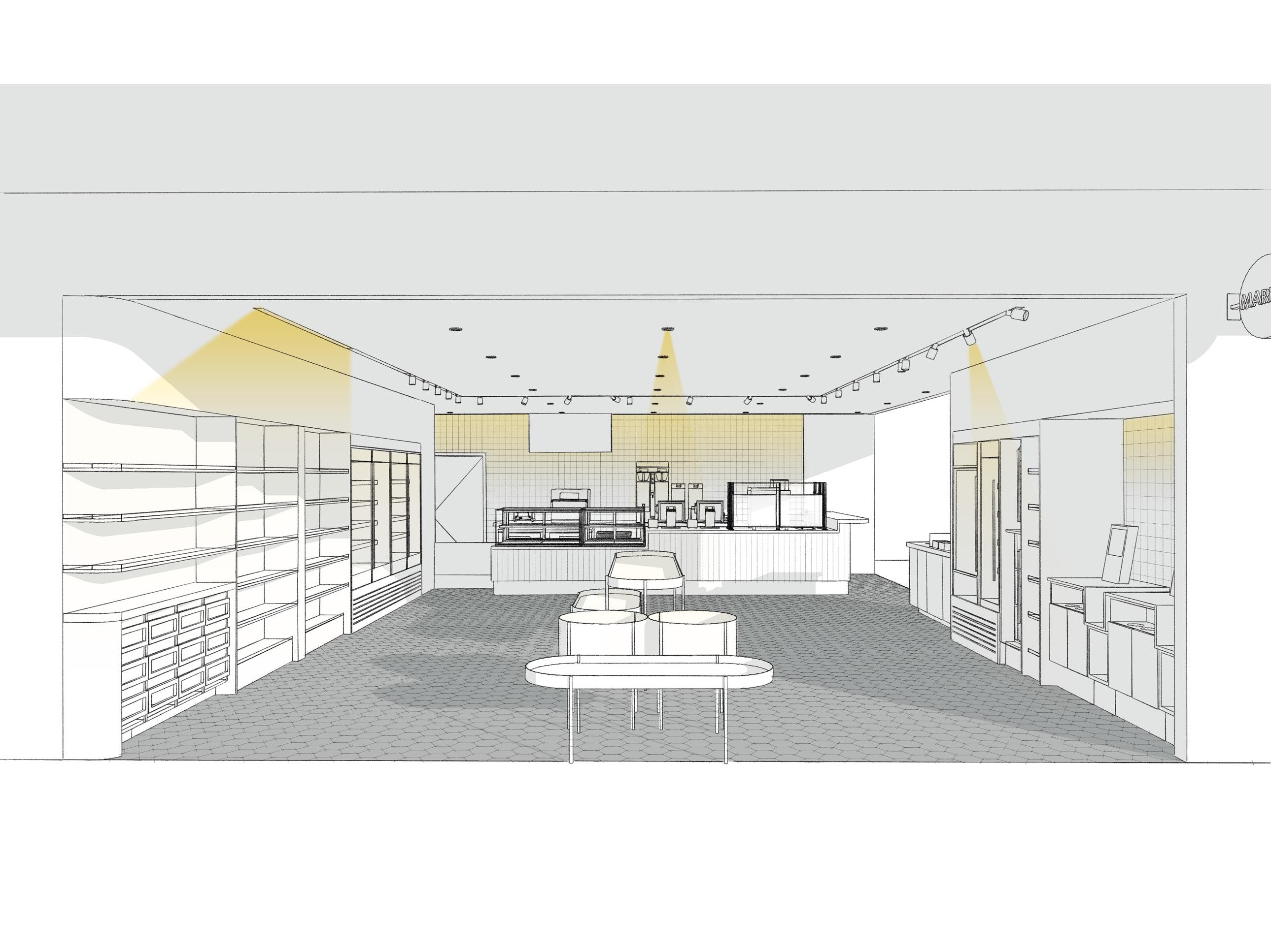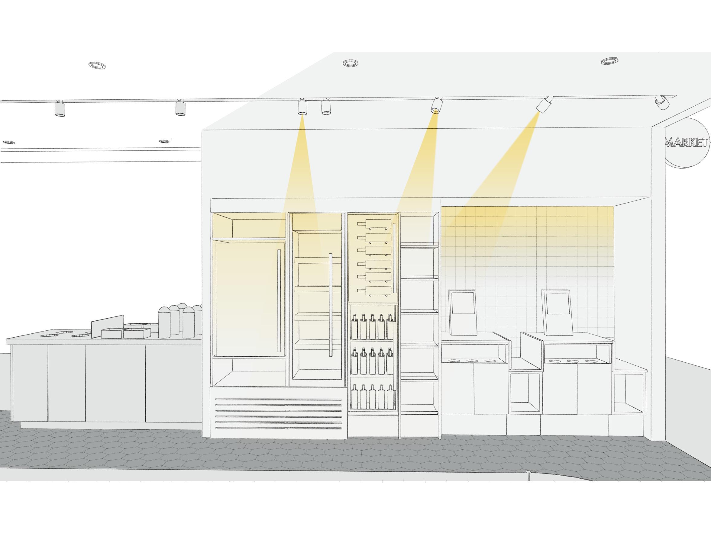 Products should be the focal point of the market. Neutral finishes serve as the backdrop to the market with key finishes used to highlight the coffee and payment areas.